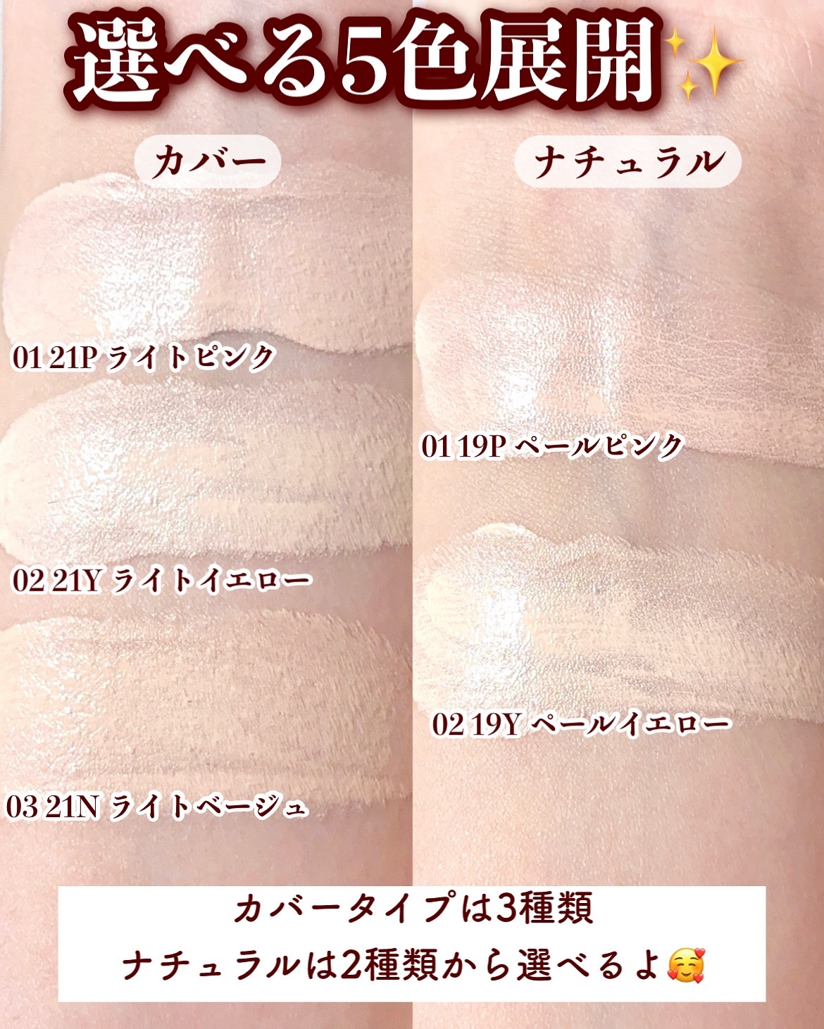 自分のなりたい肌に合わせて、カバータイプ全3色とナチュラルタイプ全2色から選べるのは嬉しい! 私は赤みが気になるけど素肌感は求めたいのでナチュラルのペールイエローが特にお気に入り♡ ぜひ気になった方は、チェックしてみてください🫶🏻️💓