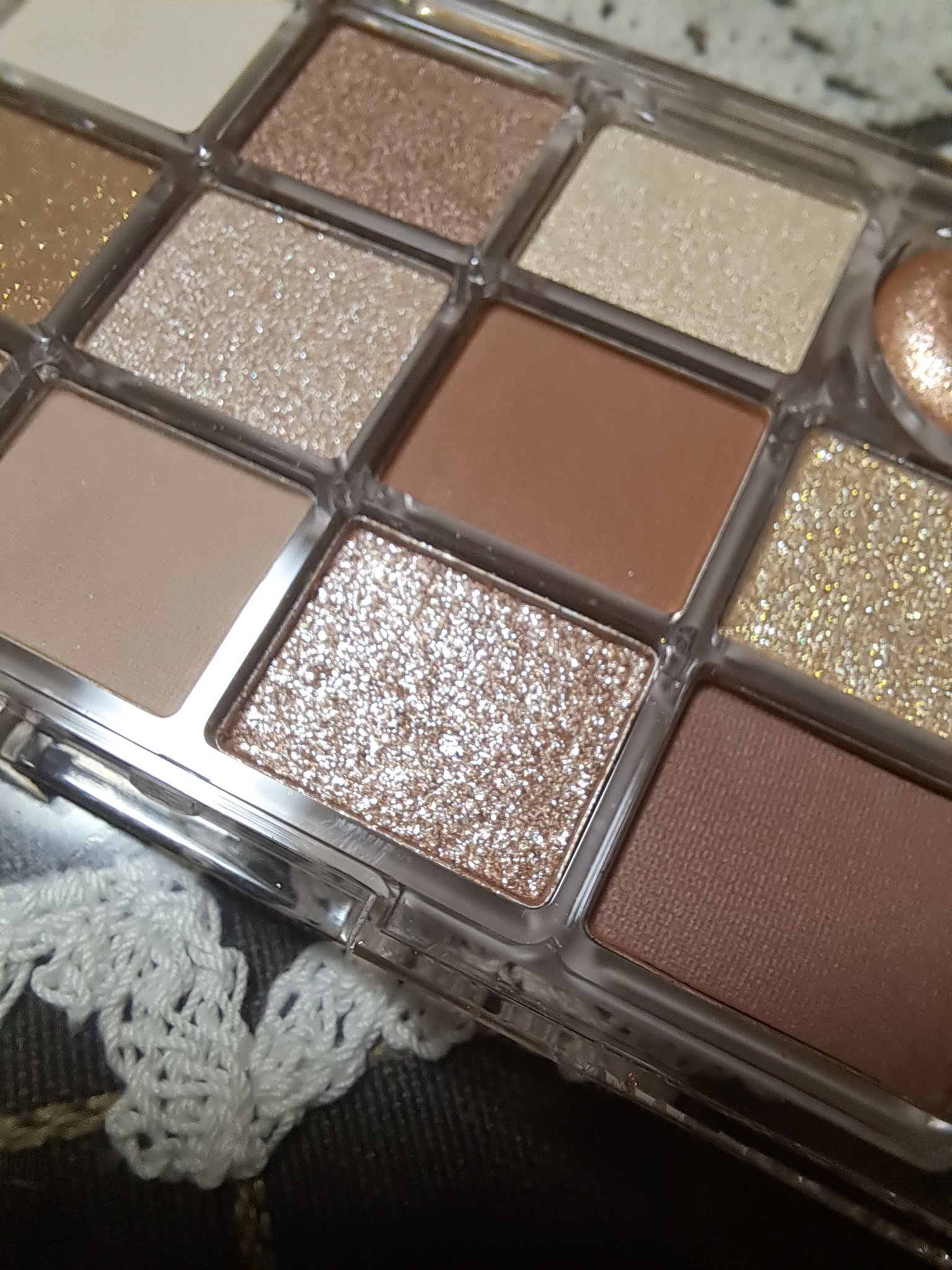 左上のラメは、ゴールドにちょっとピンクがかった?色で派手さこそ無いものの、しっとりとした粉質で瞼に優しく光をくれます。 右上の明るいブラウンは、中間色として使えそうです。ココアのような色でもあるのですが、イエベでも使えます。 左下の濃いブラウンは、締め色として使えます。アイライナー代わりに入れても良さそう。 右下のオレンジは、パッと華やぐ色です。透け感のあるオレンジなので、オレンジメイクが苦手!という方でも使いやすいカラーです。 全体的に温かみのあるカラーで、秋らしいカラーかなと思います。また、透け感が強いので、いかにもマット!というアイシャドウが苦手な方でも使いやすいパレットかと。