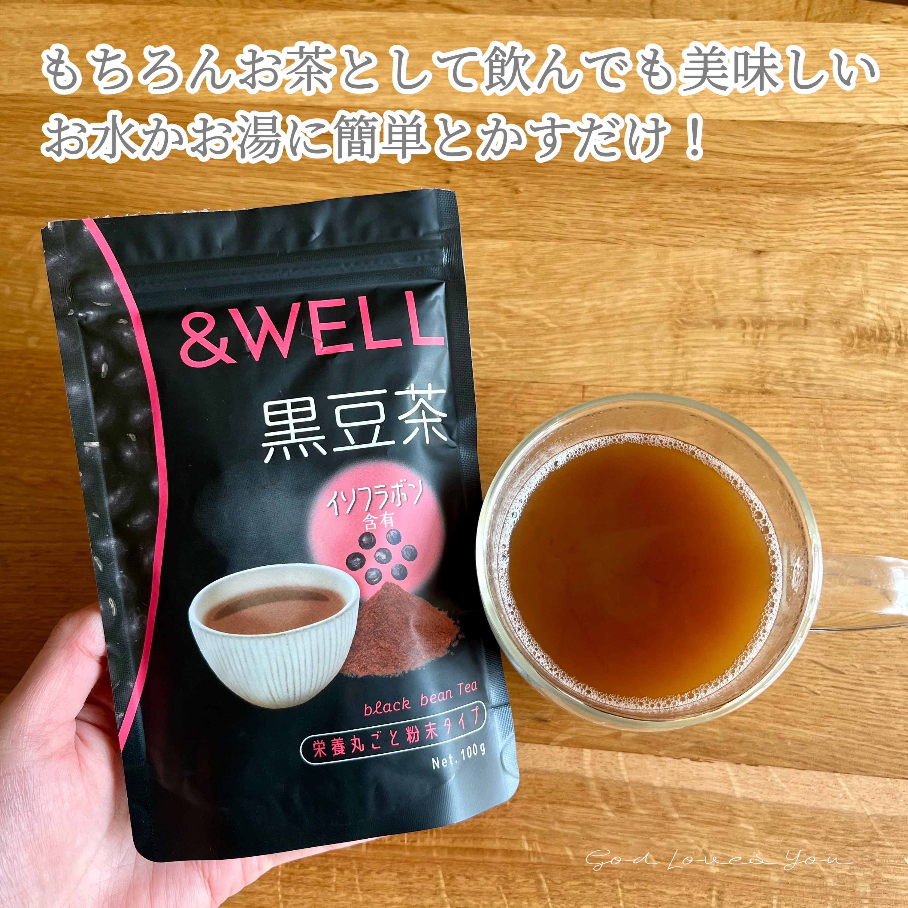 大豆イソフラボン、アントシアニン、大豆プロテインなどの栄養素がお茶として手軽に補えるフェムケア食品【&WELL】『黒豆茶』。 栄養まるごと粉末タイプだから、大豆イソフラボン、アントシアニン、大豆レシチン、大豆プロテイン、食物繊維、サポニン、カリウム、カルシウム、ビタミンBなどの黒大豆の栄養が丸ごと余すことなく摂取できて助かっています。 蒸気により蒸し上げてからじっくり焙煎する独自製法(蒸し上げ焙煎)を採用しているからお湯を注いですぐに香ばしい香りがたちます💯