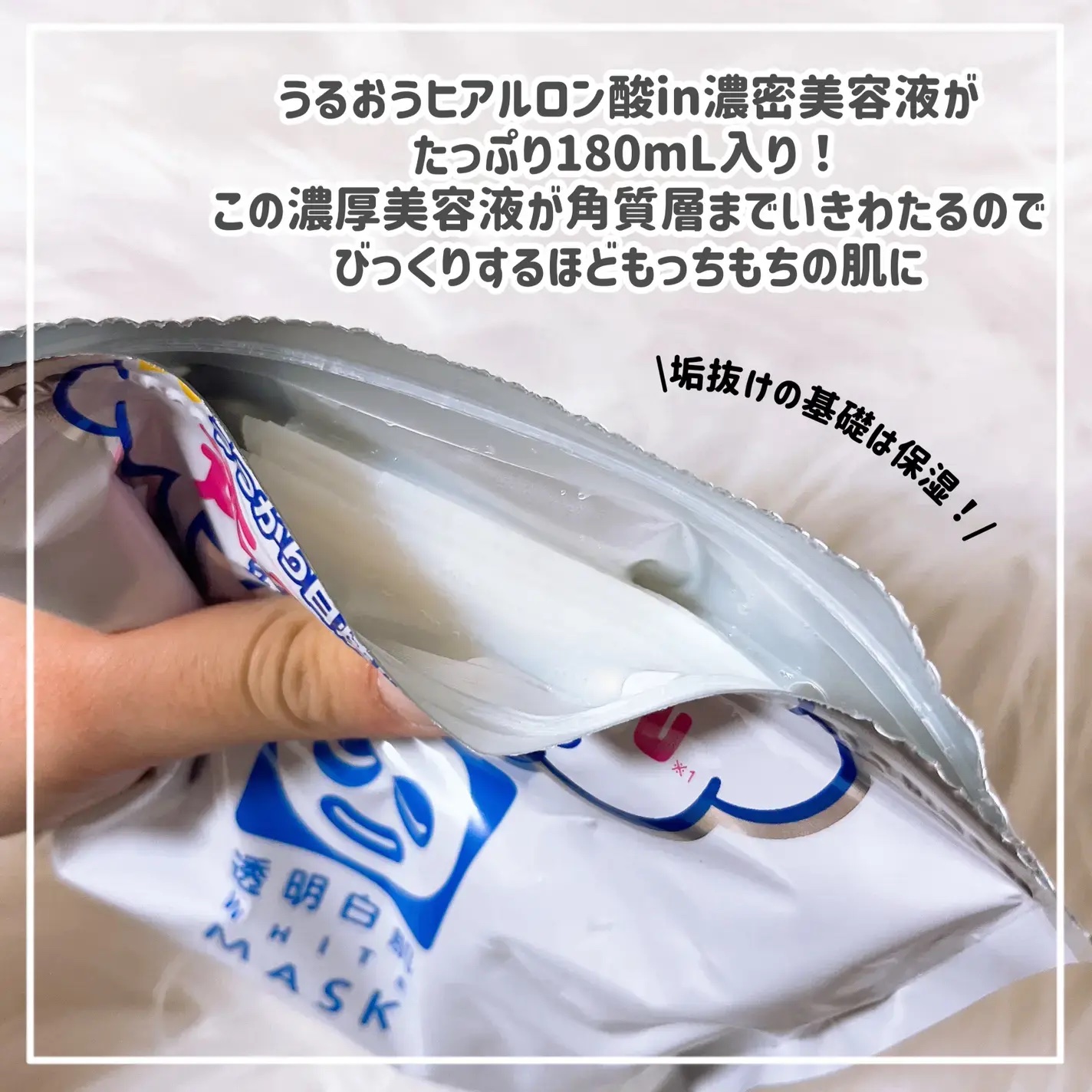 透明白肌 薬用ホワイトパックN〈医薬部外品〉 たっぷり塗って5分間パックすると肌がパッと明るくなって透き通るような肌になれるホワイトパック! 透明肌成分「豆乳発酵液、植物プラセンタ、コラーゲン」も配合されているので透明感のあるぷるぷる素肌に近づきます。 透明白肌 ホワイトマスクN 透明肌成分などの選び抜かれた成分が角質層までグングン浸透して、うるおいと透明感を同時に叶えてくれるシートマスク。