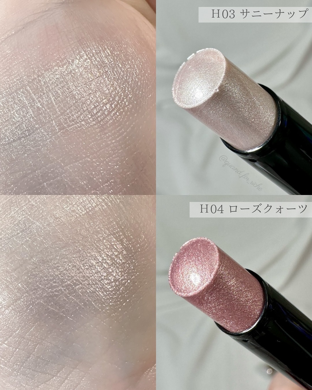 - ※2025年8月以降、「H03 サニーナップ」「H04 ローズクォーツ」のパッケージデザインを順次変更いたします。尚、これにかかる商品の返品・交換は承っておりません。 超高密着なのにサラサラ質感のスティックハイライト。 独自の成膜技術でお肌に超密着し、長時間ヨレにくくきらめきを逃がさない。 70%水分配合でひんやり気持ちいい、お肌も心もみずみずしく。 <H01 ムーンライト> 月明かりのように静かに輝くシルバーラメ。みずみずしくきらめく大粒ラメで濡れツヤ肌に。 <H03 サニーナップ> 肌なじみのいいほんのりベージュの煌めき。ぽかぽか太陽のように自然な輝きを。 <H04 ローズクォーツ> 水晶のように透け感のあるピンクラメ。血色のある優しい輝きで魅力的な多幸感メイクに。