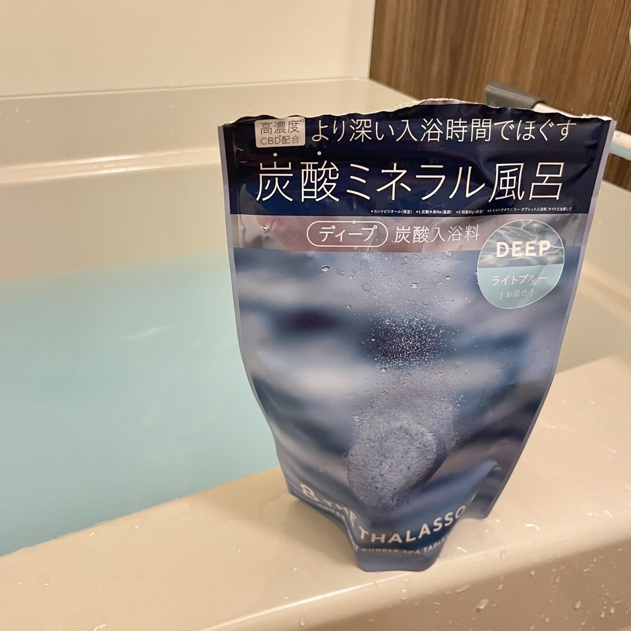 - スキンケア発想!自宅で炭酸スパが楽しめる、「CBD*1×重炭酸*2×エプソムソルト*3」配合のタブレット入浴料。海の恵みを凝縮した重炭酸*2スパで芯までじんわり温かく。さらに、柔らかくなめらかなお湯がカラダをやさしく包み込み、肌の潤いを保ちながら健やかに整えます。「ディープ」タイプは、CBD*1を高濃度*4配合!より深い安らぎの温浴タイムをお楽しみいただけます。ライトブルーのお湯色。ムスキーサボンの香り。 *1 カンナビジオール *2 炭酸水素Na(基剤) *3 硫酸Mg(保湿) *4 エイトザタラソ ユー タブレット入浴料 ライトと比較して