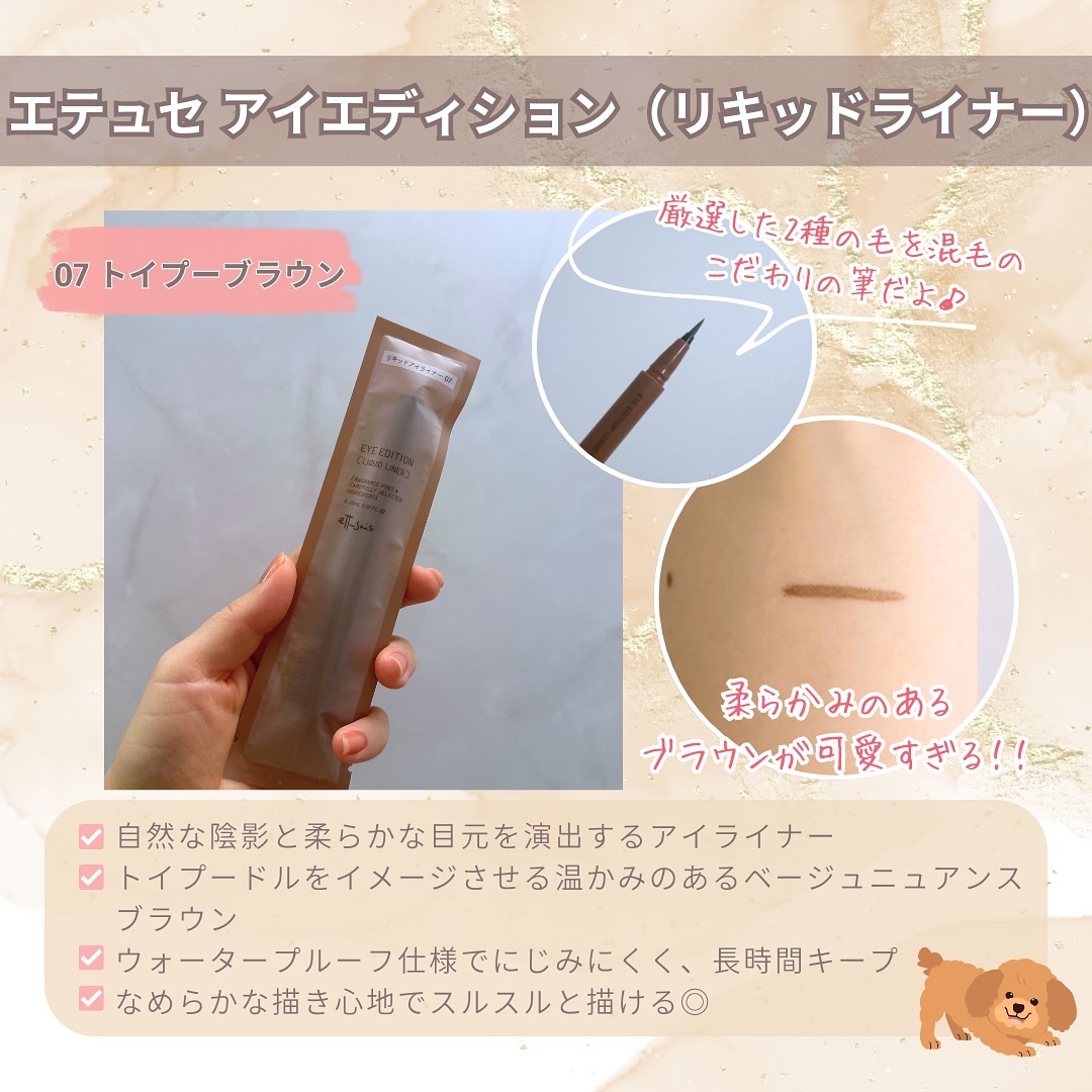 温かみのあるコーラルカラー!寒いからこそのぬくもりカラーで目元が明るく優しい印象になるよ! 可愛らしいトイプードルのようなブラウンカラー!目元が自然に引き立って新色のアイシャドウとも相性抜群! セットで使うのが可愛い🤎