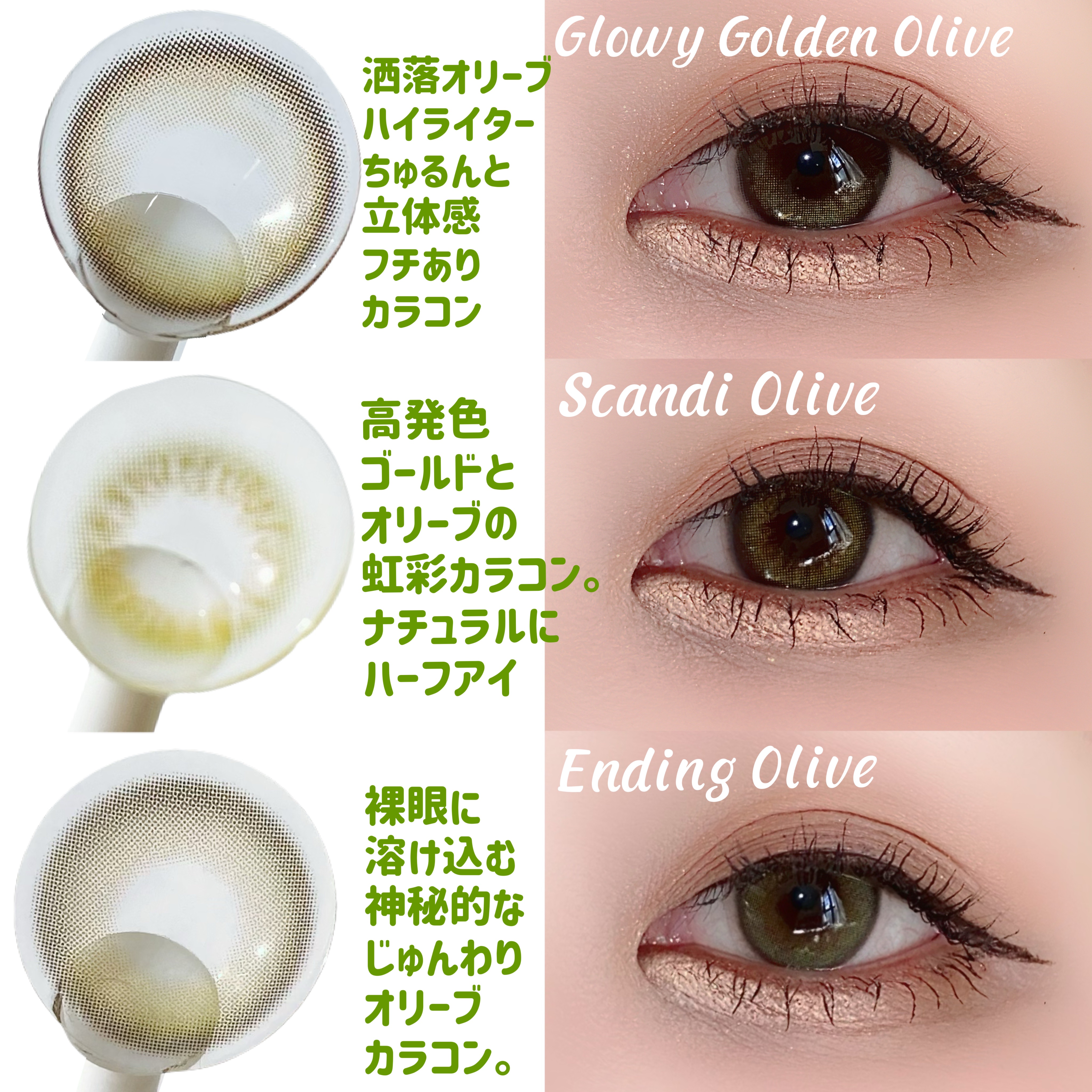 このオリーブはコスプレ感もなく使えて、浮かずに馴染むから可愛いよーー🍀 やっぱりGlowyが1番すき。 裸眼風に溶け込み神秘的な印象しっかりオリーブ感だしたいならこれ。