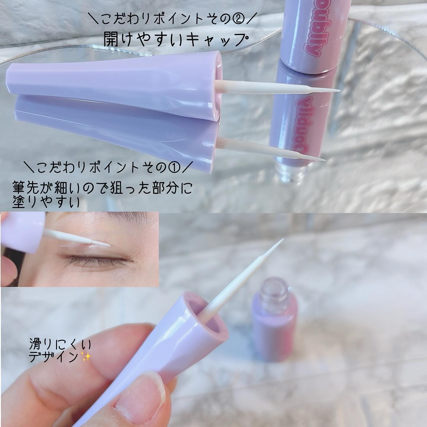 皮膚感覚ふたえで自然な目元。他にはない“ギュっ”と引締って人工皮膜を形成、綺麗な二重に。 引締り・保湿・速乾アップグレード! 開けやすいキャップで滑らず開け閉め簡単。重ため一重を二重にするため使ってます。