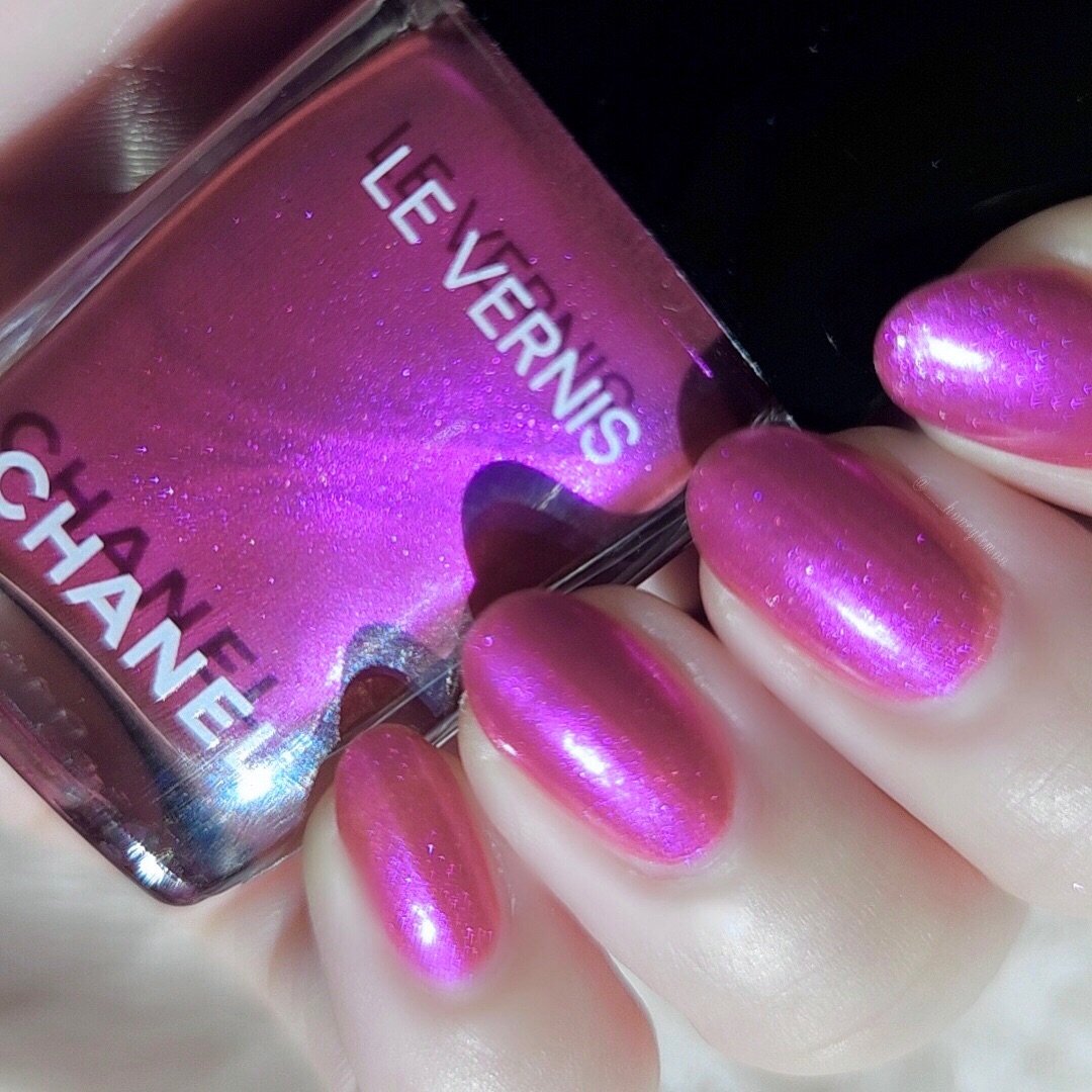 細かなパールがぎっしり!少しミラー感のあるメタリックピンクで、パープルっぽい青みもあるのでまさに私の理想の色でした😍💖 シャルメとはフランス語で魅了する、うっとりさせる、楽しませる、満足させる、喜ばせる、魔法にかけるといった意味があるそうでネーミングも素敵ですね♥️ 一度塗りで少しシアーに、二度塗りでしっかりパキッと発色、三度塗りでスマイルラインなど元の爪が全く見えなくなります❤️