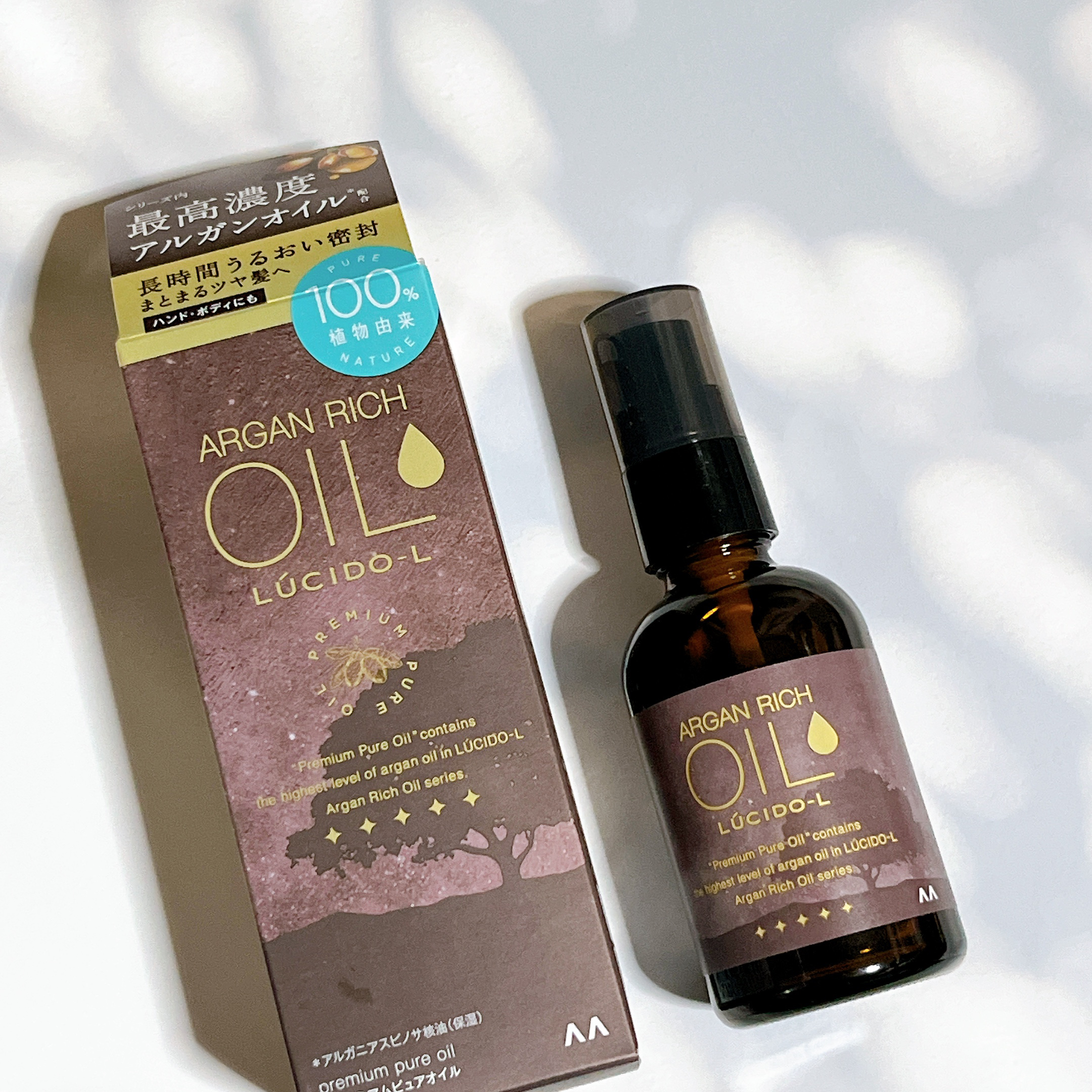 人気のルシードエルヘアオイルからプレミアムタイプが登場!極・うるツヤ髪へ こちらは、なんと‼️ハンドケアもできるとのことで、ヘアケアをした後そのままもうワンプッシュし🖐️の保湿をしてます🥰 シリーズ最高濃度のアルガンオイル※1配合。髪の広がりやパサつきを抑え、艶やかな髪へと導きます。