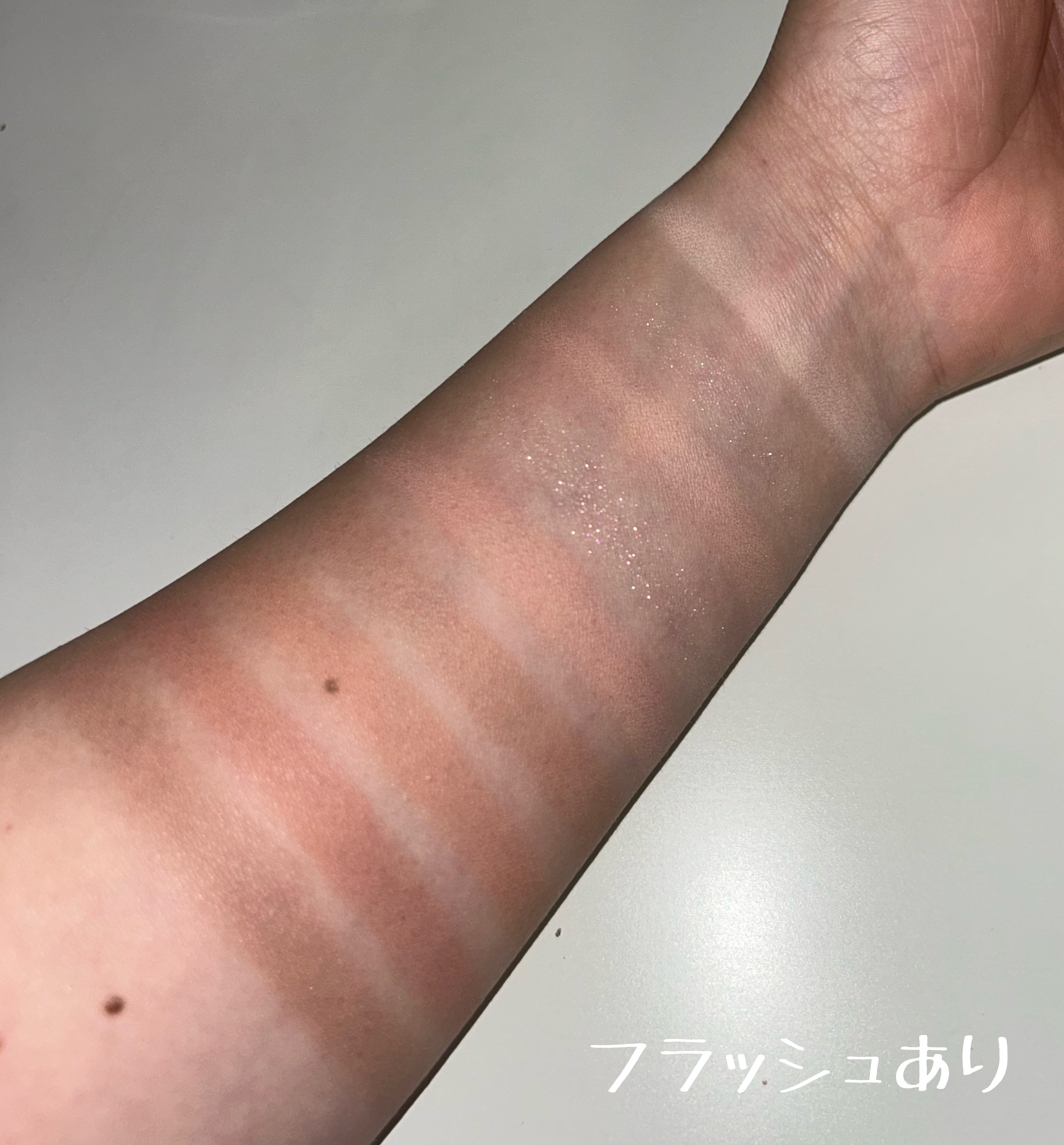 まずアイシャドウ!なんてかわいいオレンジなんでしょう🧡 bの色がボルドーっぽく見えますが、こちらもかなりオレンジで全体的にピンクオレンジのパレットです 粉が柔らかい(ブラシに付きやすい)ので指やチップで塗った方が良さそうだなと思いました💭 粉が柔らかい分、若干顔に落ちやすいというかラメ飛びしやすい感じはありましたが、ほっぺがキラキラになってしまう、、という程では無いので私はあまり気になりませんでした😌 そしてチーク!これがまた好みすぎました〜! スウォッチは色が分かるように数回重ねているのでかなり淡めの発色で使いやすいです✨ 画像よりもピンク感があるかなと思います 肌なじみのいい色でこれから大活躍してくれそうです パールも混ざっているので自然とツヤ肌に仕上がります