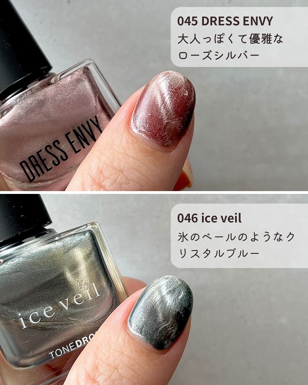 サテンのようなキラつやな輝きがホリデーシーズンにマッチ🎄✨ 045 Dress Envy (ドレスエンビー)ドレスが嫉妬する、優雅なシルバーローズ 046 Ice Vell(アイスベール)氷のベールのように澄み渡るクリスタルブルー