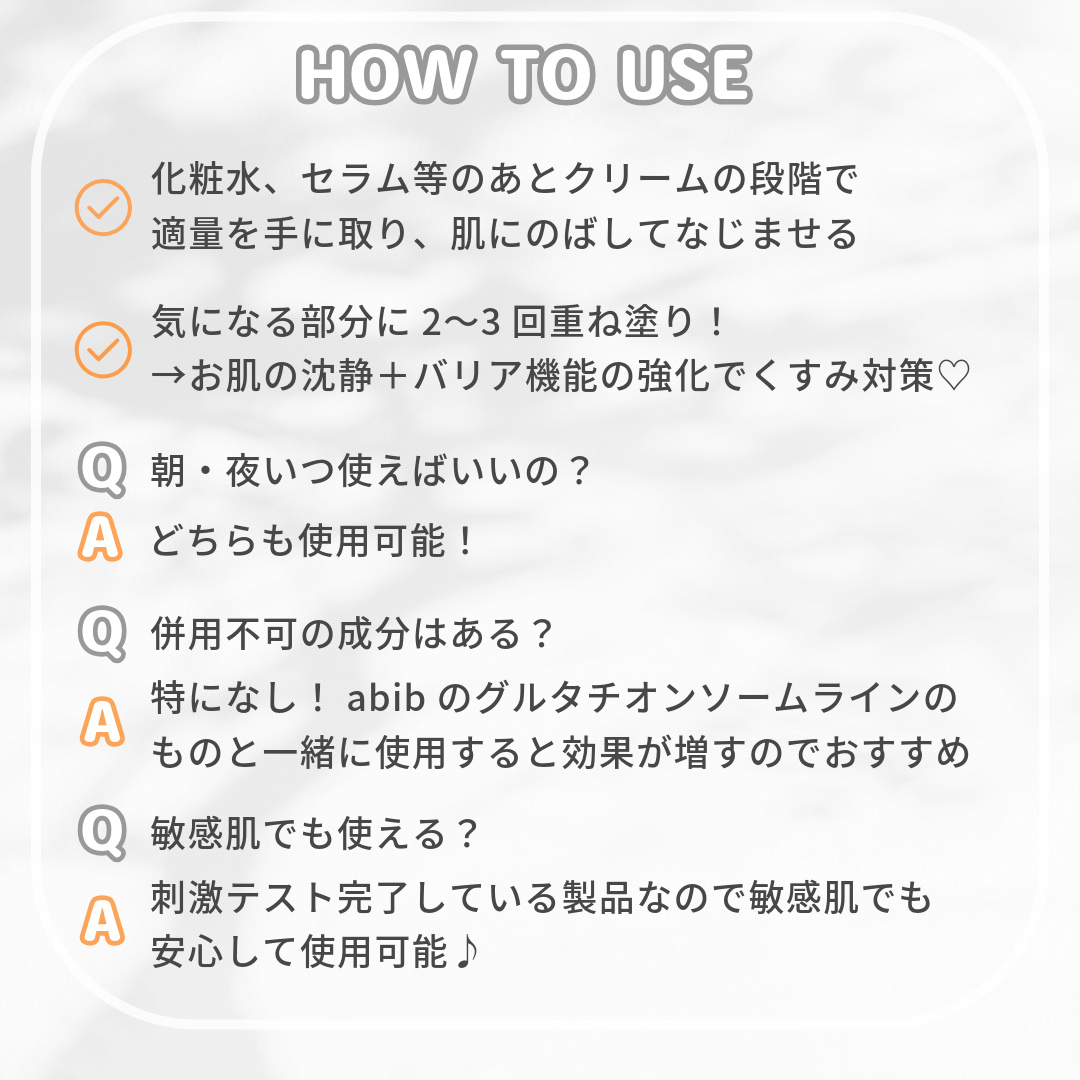- Abibの大人気シリーズ「グルタチオンソームライン」から新登場♪ 3日間で肌の表面に見えるシミ・ソバカスから根強く生えたくすみケアまで可能なグルタチオンソームクリーム! ①3日で薄くなる確実なくすみケア シミの除去、肌のトーンアップに効果的な成分が高含量配合。 3日後に目で見て、感じられる透明できれいな肌に。 シミの主な原因であるメラニンの生成抑制から色素移動妨害、合成抑制に効果的。 ②くすみ解決から予防まで完璧にケア! くすみの原因も外部刺激! 1.外部刺激による鎮静と保湿+ 2.くすみケア + 3.肌バリア強化を通してくすみ悩みを解決! ③ライン使いでシナジーUPケア! [臨床テスト完了] グルタチオンソームセラムと同じくすみ有効成分配合でシナジー効果アップ! 臨床テストも完了している為、敏感肌の方にもご安心してお使いいただけます。 *皮膚色素沈着(シミ・くすみ・メラニン)改善テスト完了/(株)Skinmed 臨床試験センター *敏感性皮膚一次刺激テスト完了/(株)Skinmed 臨床試験センター 使い方→セラムを塗布し浸透させた後、くすみが気になる部分に重ね塗りをして集中密着ケア!