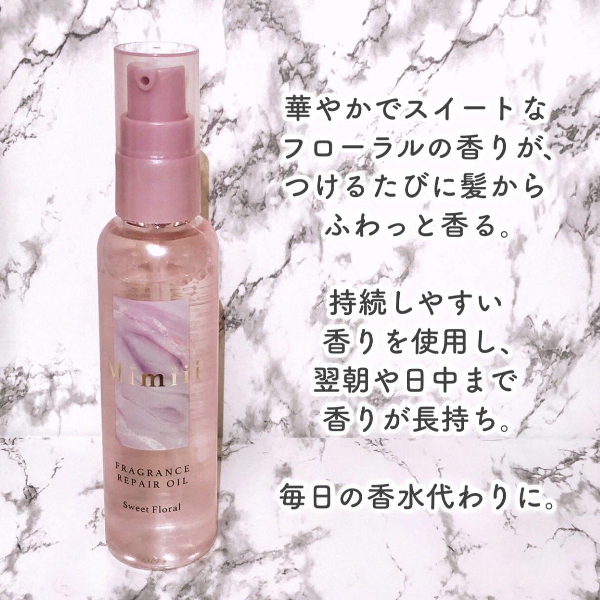- ①香水のように香る こだわりの「フローラル」と「サボン」の2つの香り持続しやすい香りを使用し、翌朝や日中まで香りが持続。 ふわっとした贅沢な香り立ちにこだわり開発。 ②補修成分が髪にうるおいとツヤを与える 配合成分:ハチミツ、アミノ酸系成分 ③サラサラでまとまる髪に導く 配合成分:ケラチン、厳選した10種類の植物エキス配合