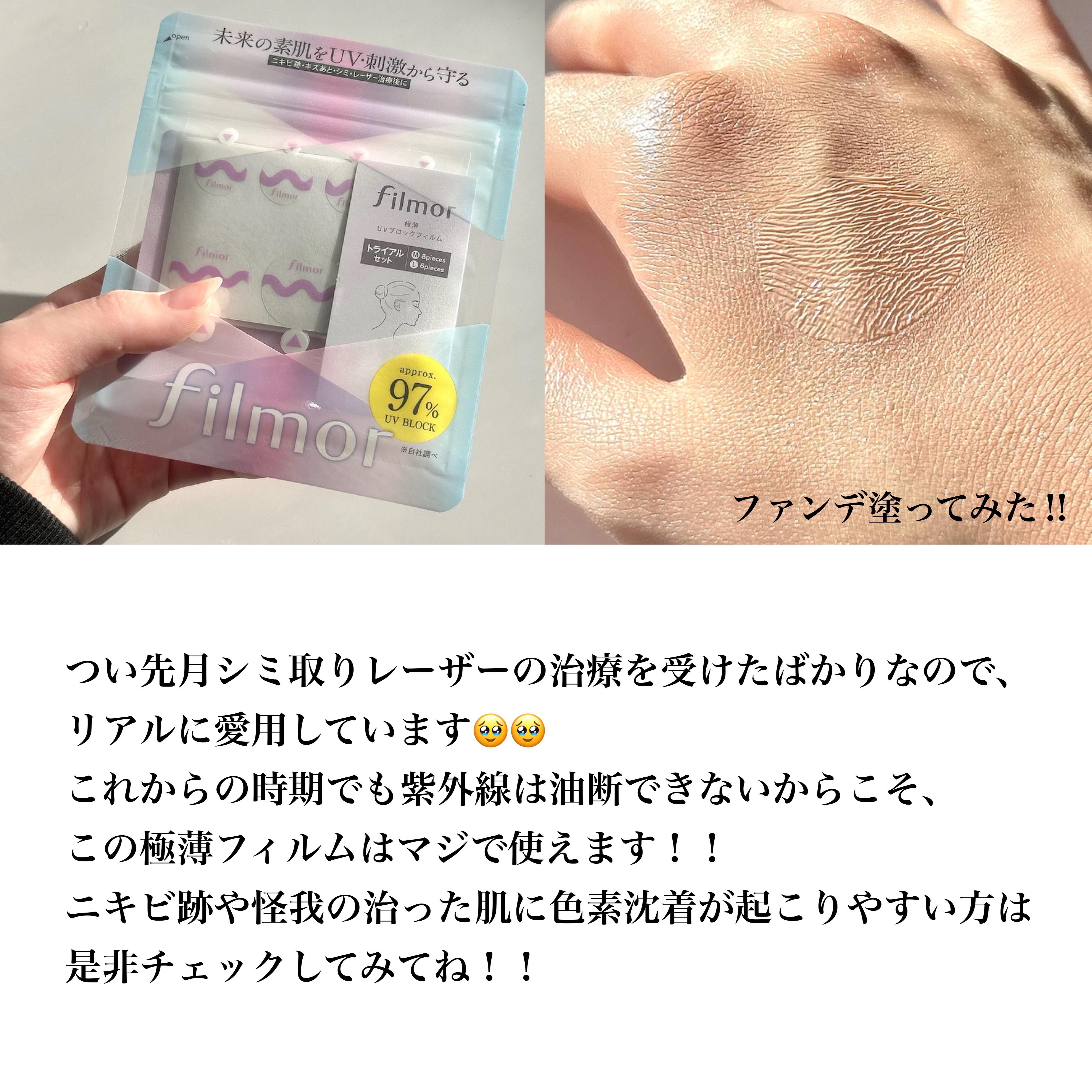 - UVを約97%*1カットして、ニキビ跡・キズあと・シミ・レーザー後の肌を守る*2、極薄UVブロックフィルム。 日常使いから、ゴルフ・海水浴などのアウトドアまで、幅広くご使用いただけます。 【貼っている間ずっとUV・摩擦や乾燥の刺激から肌を守る】 filmorは貼っている間、高いUVブロック率がずっと続きます。 衣類等との摩擦にも強く、防水性があるため、肌からはがれにくく長時間ご使用いただけます。 【快適な貼りごこち】 フィルムの薄さは0.007mm(卵の薄皮の約1/10の薄さ)と極薄。貼っていることを忘れるほど、とても軽くやわらかい貼りごこちです。 また、汗をかいてもムレにくいフィルムを使用しているので暑い季節でも快適にお使いいただけます。 【透明で目立ちにくい】 透明でテカリを抑えたフィルムなので、周りから貼っていることが気付かれにくいです。 また上からメイクをしていただくと、さらに自然な仕上がりに。 フィルムを貼ることで、キズあとに直接化粧品や指が触れることを防ぎます。 *1自社調べ *2フィルムの物理的効果による