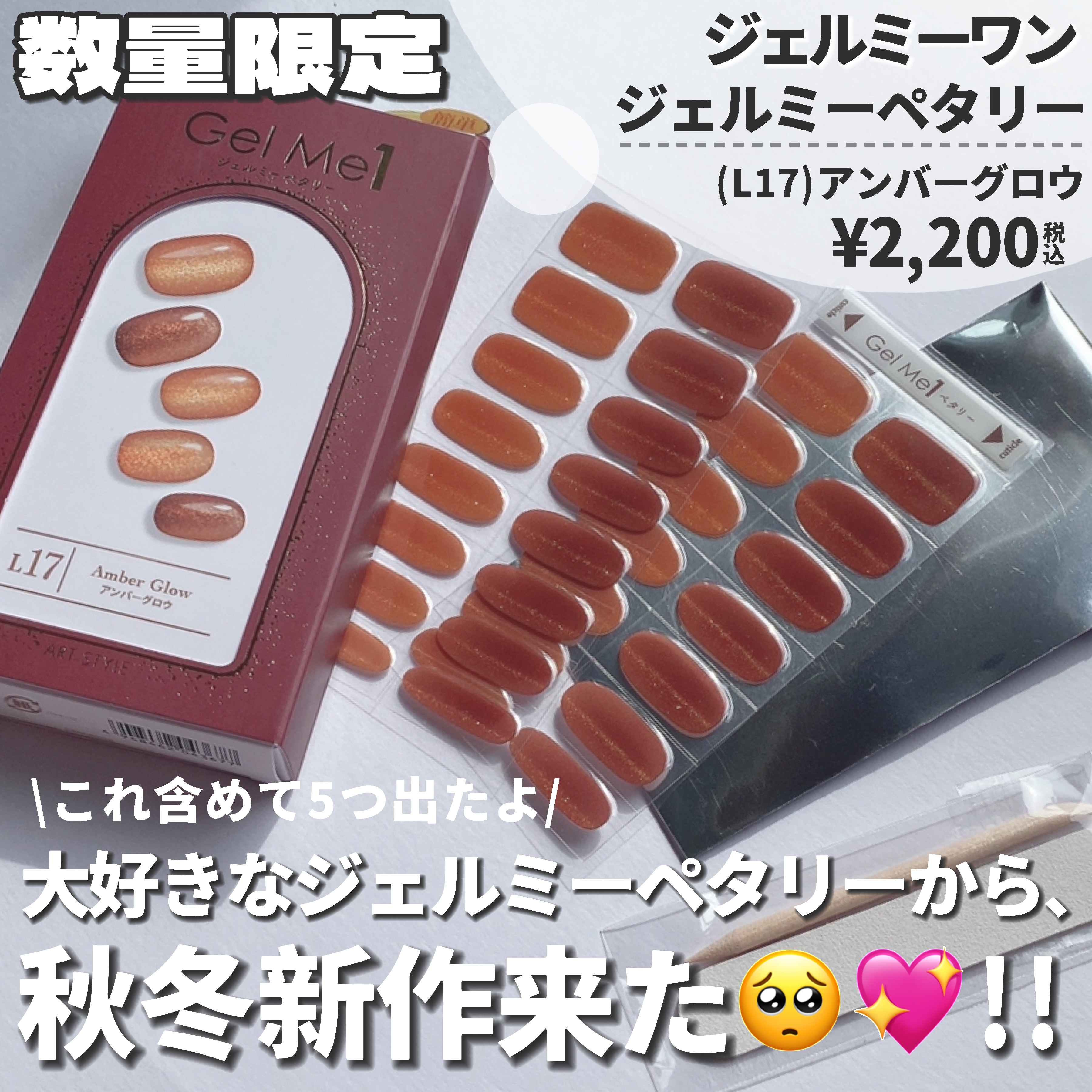 - おうちで長持ちジェルネイル『ジェルミーワン』から誕生した、硬化タイプのジェルネイルシール『ジェルミーペタリー』。貼ってライトを当てるだけで、簡単にサロンクオリティのセルフジェルネイルが楽しめます。 ジェルミーペタリー3つのポイント 〈Point1〉ぴったりやわらかフィット 柔らかさにこだわったシールは、高密着で爪に隙間なくフィット! 〈Point2〉70%リアルジェル配合 リアルジェル配合だからずっとツヤツヤ、自然で綺麗な仕上がり 〈Point3〉しっかり2週間*長持ち 水仕事にも強く、ぷっくり&ツヤツヤをキープしたまま2週間長持ち*でオフも簡単剥がすだけ! *個人差があります ※リニューアル履歴について:2023年3月4日(土)より一部バラエティショップ・公式オンラインショップ、2023年3月25日(土)よりその他全国のバラエティ・ドラッグストア・一部オンラインストアにてリニューアル発売