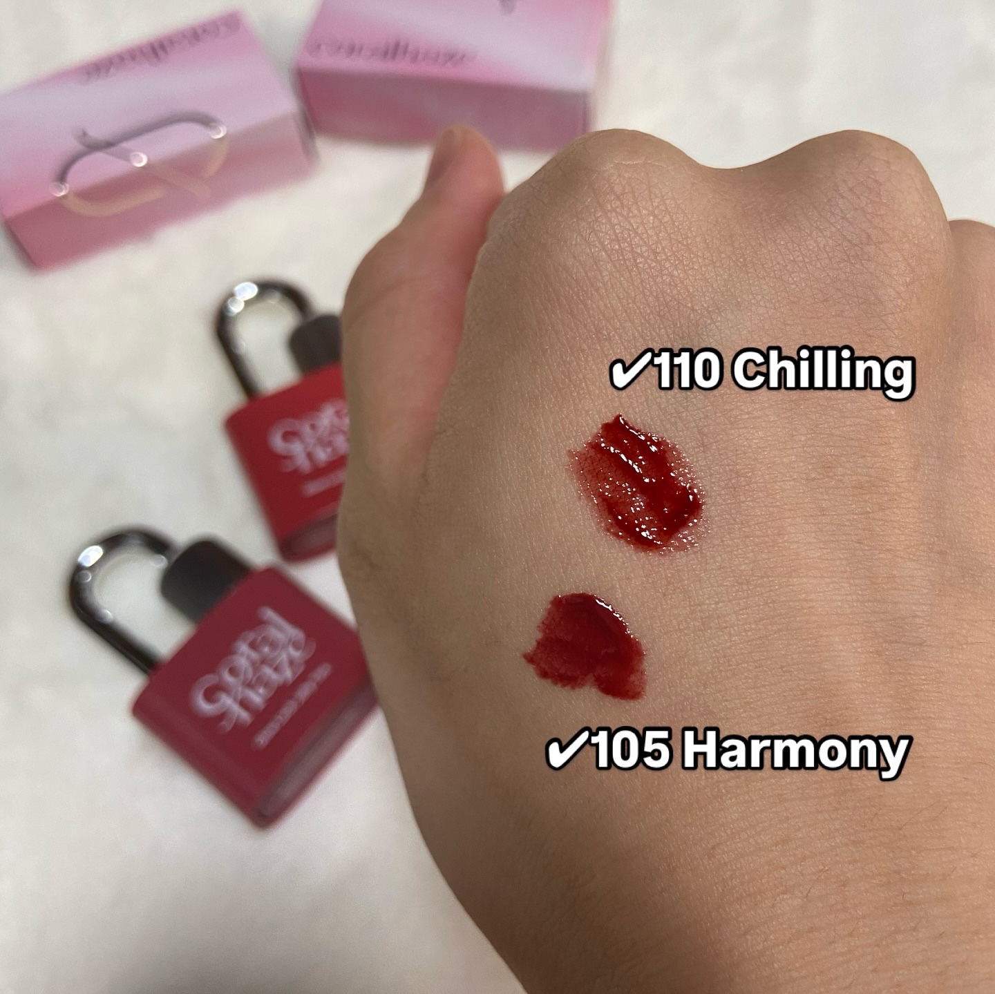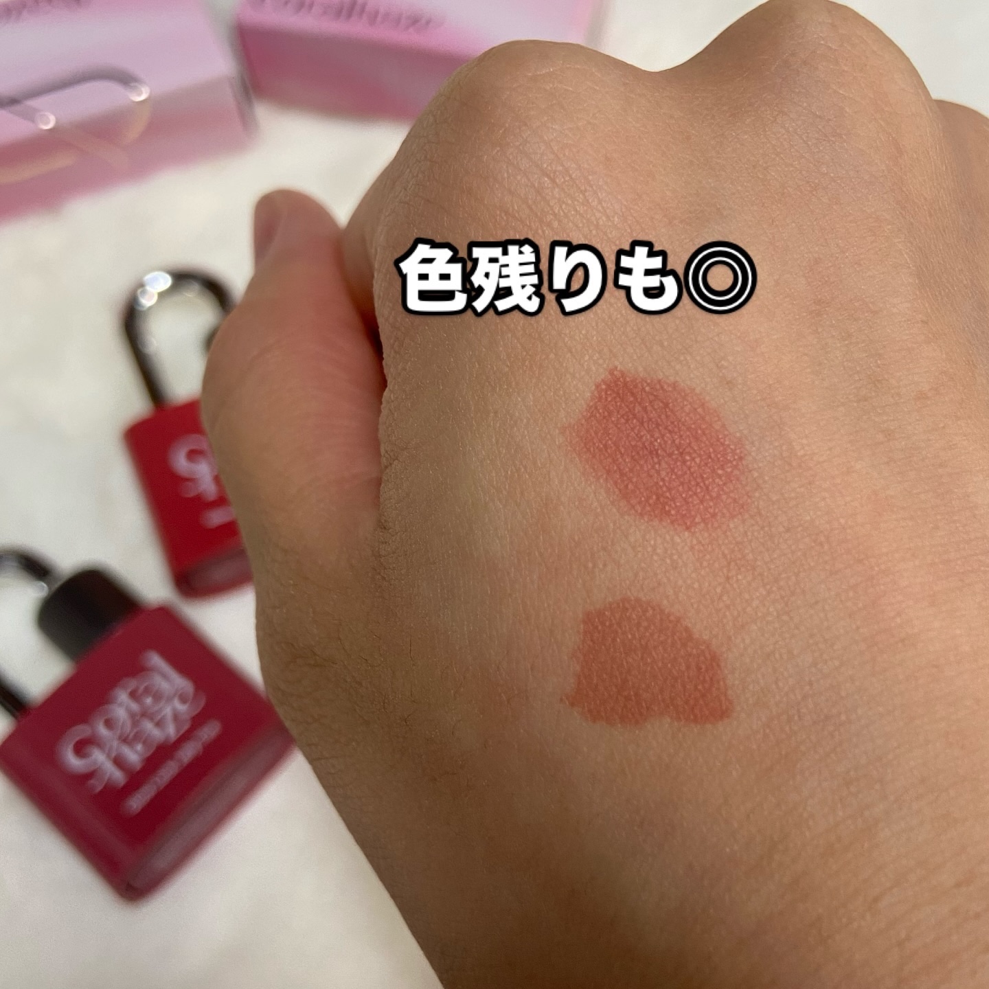 パケが南京錠みたいなリップ🔒✨ こんな形初めて見る👀🩷 ポーチやバッグに付けたくなる可愛さ🔒🩷 ツヤ感あるティントで塗り重ねる程にツヤ感が増すのが特徴💋✨ 個人的にツヤ感があるから赤やブラウンなどの重たくなりがちなカラーも使いやすいのがいいと思った💄✨