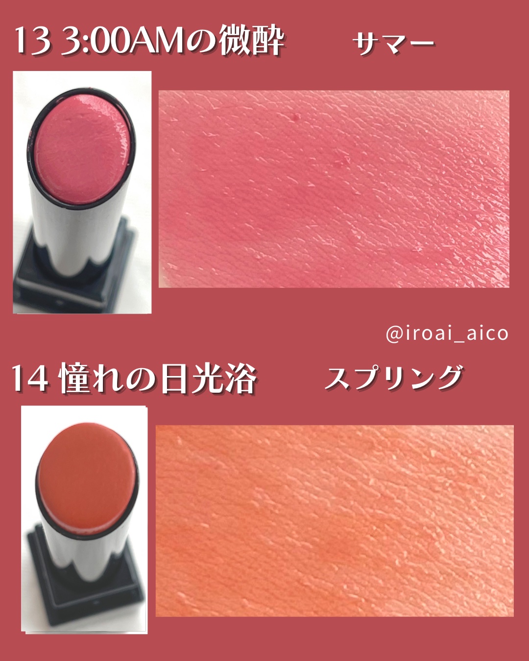 - <01 欲望の塊> テトライソステアリン酸ジペンタエリスリチル、トリ(カプリル酸/カプリン酸)グリセリル、オクチルドデカノール、ラウロイルグルタミン酸ジ(フィトステリル/オクチルドデシル)、ビスアルキル(C16-18)グリセリルウンデシルジメチコン、イソノナン酸イソトリデシル、水添ポリイソブテン、ラウロイルグルタミン酸ジ(オクチルドデシル/フィトステリル/ベヘニル)、パラフィン、合成ワックス、ダイマージリノール酸(フィトステリル/イソステアリル/セチル/ステアリル/ベヘニル)、マイクロクリスタリンワックス、水添マイクロクリスタリンワックス、ヒドロキシステアリン酸エチルヘキシル、トコフェロール、ホホバ種子油、オリーブ果実油、アーモンド油、(エチレン/プロピレン)コポリマー、ポリエチレン、ジメチコン、(+/-)(チタン/酸化チタン)焼結物、マイカ、ラウロイルアスパラギン酸Na、ラウロイルリシン、塩化亜鉛、酸化チタン、酸化鉄、水酸化Al、硫酸Ba、トリイソステアリン酸イソプロピルチタン、酸化スズ、ホウケイ酸(Ca/Al)、合成フルオロフロゴパイト、黄4、黄5、赤104(1)、赤201、赤202 <02 ピンクバナナ> テトライソステアリン酸ジペンタエリスリチル、トリ(カプリル酸/カプリン酸)グリセリル、オクチルドデカノール、ラウロイルグルタミン酸ジ(フィトステリル/オクチルドデシル)、ビスアルキル(C16-18)グリセリルウンデシルジメチコン、イソノナン酸イソトリデシル、水添ポリイソブテン、ラウロイルグルタミン酸ジ(オクチルドデシル/フィトステリル/ベヘニル)、パラフィン、合成ワックス、ダイマージリノール酸(フィトステリル/イソステアリル/セチル/ステアリル/ベヘニル)、マイクロクリスタリンワックス、水添マイクロクリスタリンワックス、ヒドロキシステアリン酸エチルヘキシル、トコフェロール、ホホバ種子油、オリーブ果実油、アーモンド油、(エチレン/プロピレン)コポリマー、ポリエチレン、ジメチコン、(+/-)(チタン/酸化チタン)焼結物、マイカ、ラウロイルアスパラギン酸Na、ラウロイルリシン、塩化亜鉛、酸化チタン、酸化鉄、水酸化Al、硫酸Ba、トリイソステアリン酸イソプロピルチタン、酸化スズ、ホウケイ酸(Ca/Al)、合成フルオロフロゴパイト、黄4、黄5、赤104(1)、赤201、赤202 <03 陽炎> テトライソステアリン酸ジペンタエリスリチル、トリ(カプリル酸/カプリン酸)グリセリル、オクチルドデカノール、ラウロイルグルタミン酸ジ(フィトステリル/オクチルドデシル)、ビスアルキル(C16-18)グリセリルウンデシルジメチコン、イソノナン酸イソトリデシル、水添ポリイソブテン、ラウロイルグルタミン酸ジ(オクチルドデシル/フィトステリル/ベヘニル)、パラフィン、合成ワックス、ダイマージリノール酸(フィトステリル/イソステアリル/セチル/ステアリル/ベヘニル)、マイクロクリスタリンワックス、水添マイクロクリスタリンワックス、ヒドロキシステアリン酸エチルヘキシル、トコフェロール、ホホバ種子油、オリーブ果実油、アーモンド油、(エチレン/プロピレン)コポリマー、ポリエチレン、ジメチコン、(+/-)(チタン/酸化チタン)焼結物、マイカ、ラウロイルアスパラギン酸Na、ラウロイルリシン、塩化亜鉛、酸化チタン、酸化鉄、水酸化Al、硫酸Ba、トリイソステアリン酸イソプロピルチタン、酸化スズ、ホウケイ酸(Ca/Al)、合成フルオロフロゴパイト、黄4、黄5、赤104(1)、赤201、赤202 <04 パンプキンワイン> テトライソステアリン酸ジペンタエリスリチル、トリ(カプリル酸/カプリン酸)グリセリル、オクチルドデカノール、ラウロイルグルタミン酸ジ(フィトステリル/オクチルドデシル)、ビスアルキル(C16-18)グリセリルウンデシルジメチコン、イソノナン酸イソトリデシル、水添ポリイソブテン、ラウロイルグルタミン酸ジ(オクチルドデシル/フィトステリル/ベヘニル)、パラフィン、合成ワックス、ダイマージリノール酸(フィトステリル/イソステアリル/セチル/ステアリル/ベヘニル)、マイクロクリスタリンワックス、水添マイクロクリスタリンワックス、ヒドロキシステアリン酸エチルヘキシル、トコフェロール、ホホバ種子油、オリーブ果実油、アーモンド油、(エチレン/プロピレン)コポリマー、ポリエチレン、ジメチコン、(+/-)(チタン/酸化チタン)焼結物、マイカ、ラウロイルアスパラギン酸Na、ラウロイルリシン、塩化亜鉛、酸化チタン、酸化鉄、水酸化Al、硫酸Ba、トリイソステアリン酸イソプロピルチタン、酸化スズ、ホウケイ酸(Ca/Al)、合成フルオロフロゴパイト、黄4、黄5、赤104(1)、赤201、赤202 <05 ダークフィグ> テトライソステアリン酸ジペンタエリスリチル、トリ(カプリル酸/カプリン酸)グリセリル、オクチルドデカノール、ラウロイルグルタミン酸ジ(フィトステリル/オクチルドデシル)、ビスアルキル(C16-18)グリセリルウンデシルジメチコン、イソノナン酸イソトリデシル、水添ポリイソブテン、ラウロイルグルタミン酸ジ(オクチルドデシル/フィトステリル/ベヘニル)、