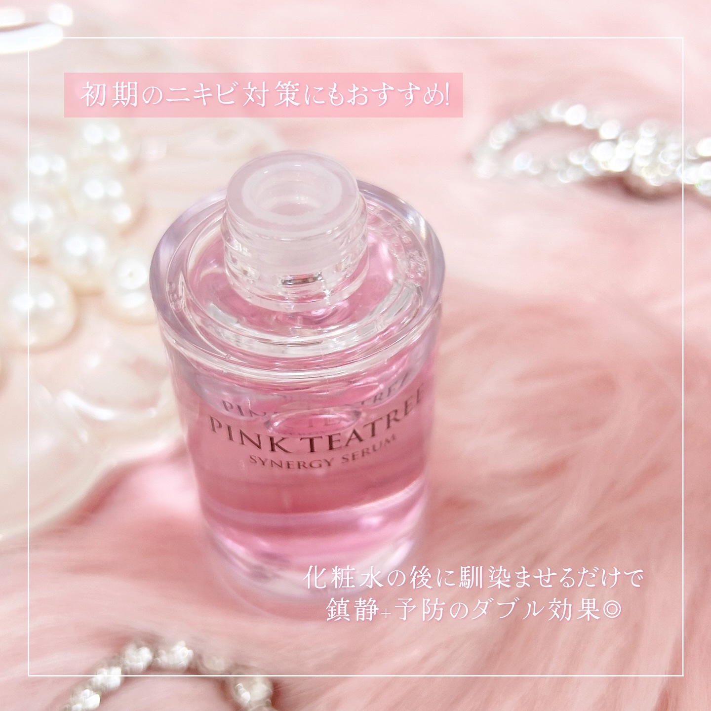 保湿成分のティーツリーやCICAが配合されている美容液です🎀 乾燥からの肌荒れに鎮静効果があり、ニキビに悩んでる方に特におすすめです🫶🏻 みずみずしくニキビ肌でも使いやすい使用感で、使ってるうちにニキビが鎮静されてきた感じがします🎶