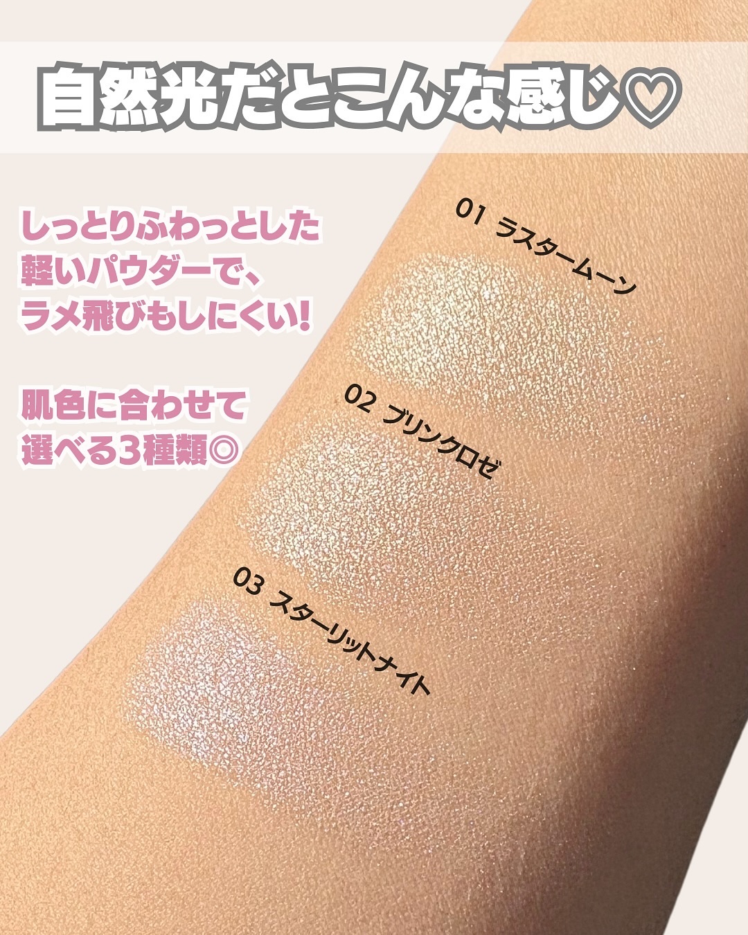 うるみ質感。 透明ツヤ膜ハイライター ふわり軽やかでなめらかなスフレタッチ 比重の軽いパウダーが採用されていてふわりと軽やかなスムース質感になっています 光の反射力に優れたダイヤモンド成分配合で繊細な煌めきが可愛い🙂↕️✨