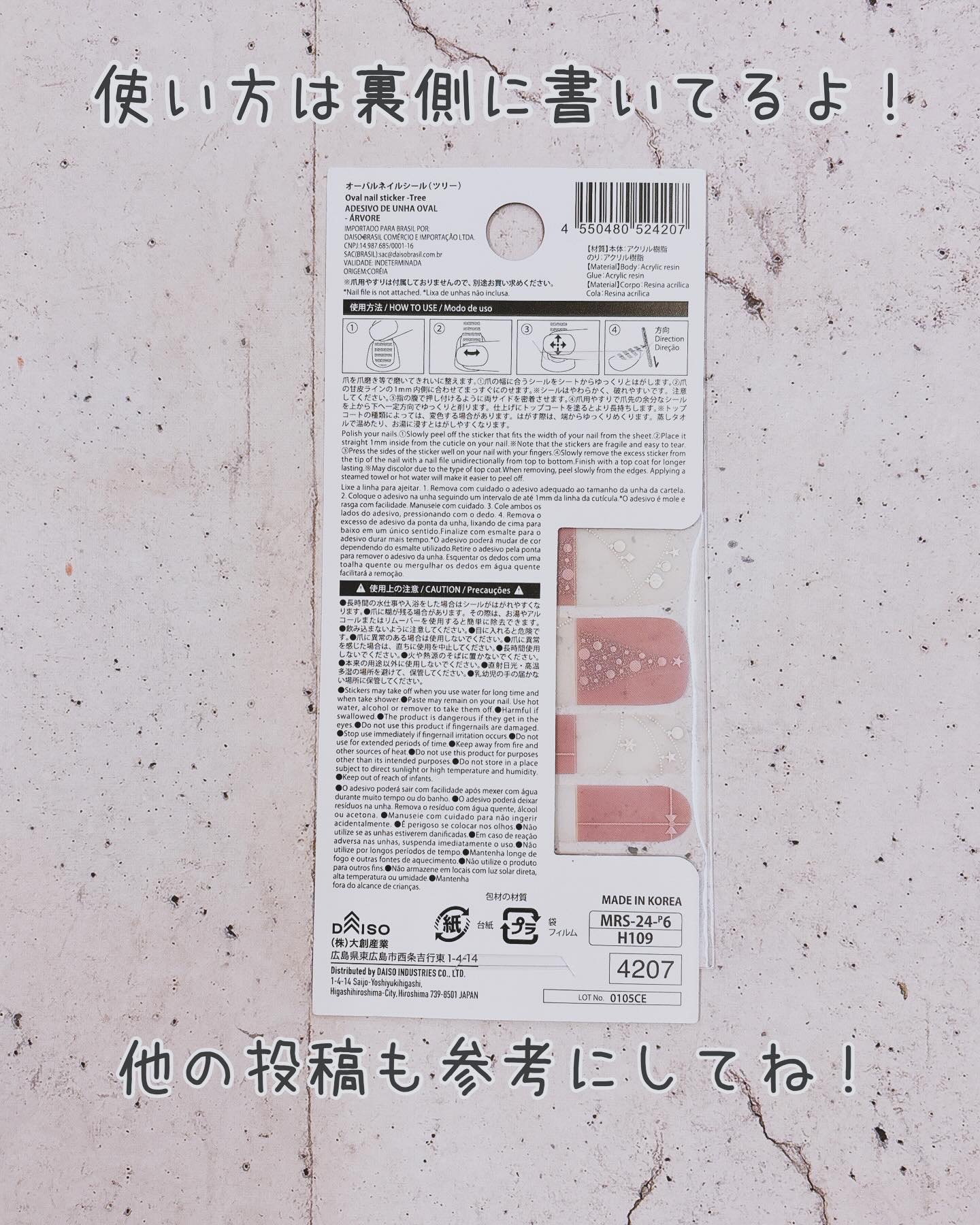 【使った商品】オーバルネイルシール【商品の特徴】貼るだけでOKな100均ネイルシール【使い方】①爪の幅に合うシールをシートからゆっくりとはがします②爪の甘皮ラインの1mm内側に合わせてまっすぐにのせます③指の腹で押し付けるように両サイドを密着...