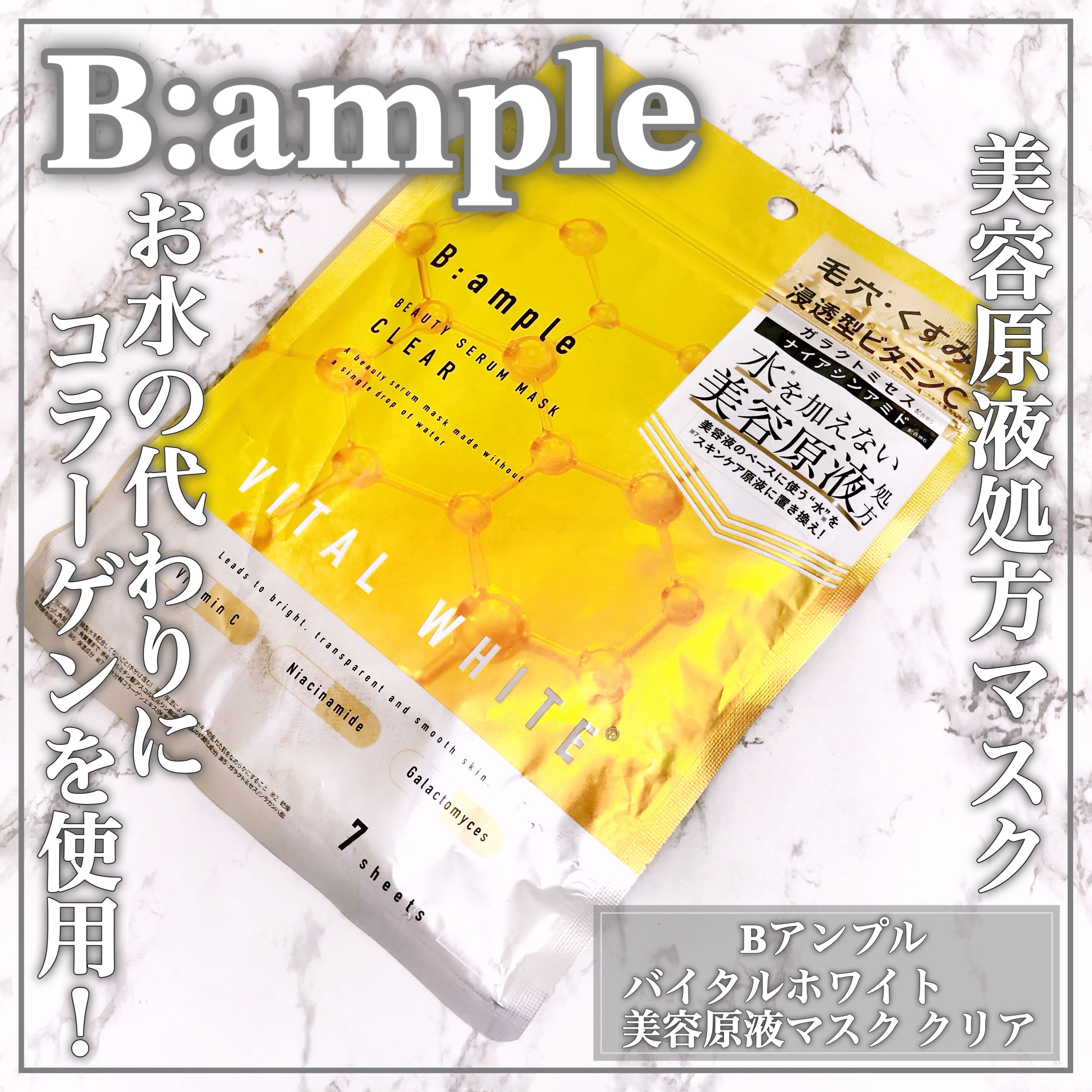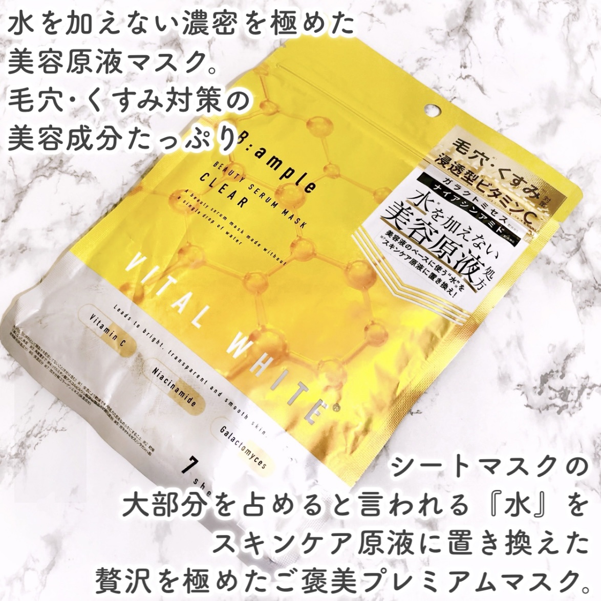 シートマスクの大部分を占めると言われる『水』をコラーゲン原液に置き換え、贅沢を極めた『水を加えない』美容原液マスクとのこと。 浸透型VC、ガラクトミセス、ナイアシンアミドと嬉しい成分が配合されていて、毛穴・くすみにアプローチするクリアタイプ。 パッケージのイエローがビタミンCを連想させてくれるので気分上がります♪