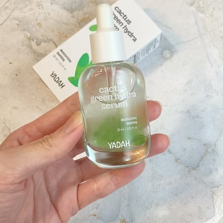 YADAH(ヤダー)カクタスグリーンハイドラセラム。見た目がとても綺麗で、みてるだけで癒される。水分、肌保護の相乗効果で油分、水分ケアができるみたい。ベタつかずに素早く肌に馴染んで、重くなくサラッとした付け心地みたいですよ。オイルボールが、保...