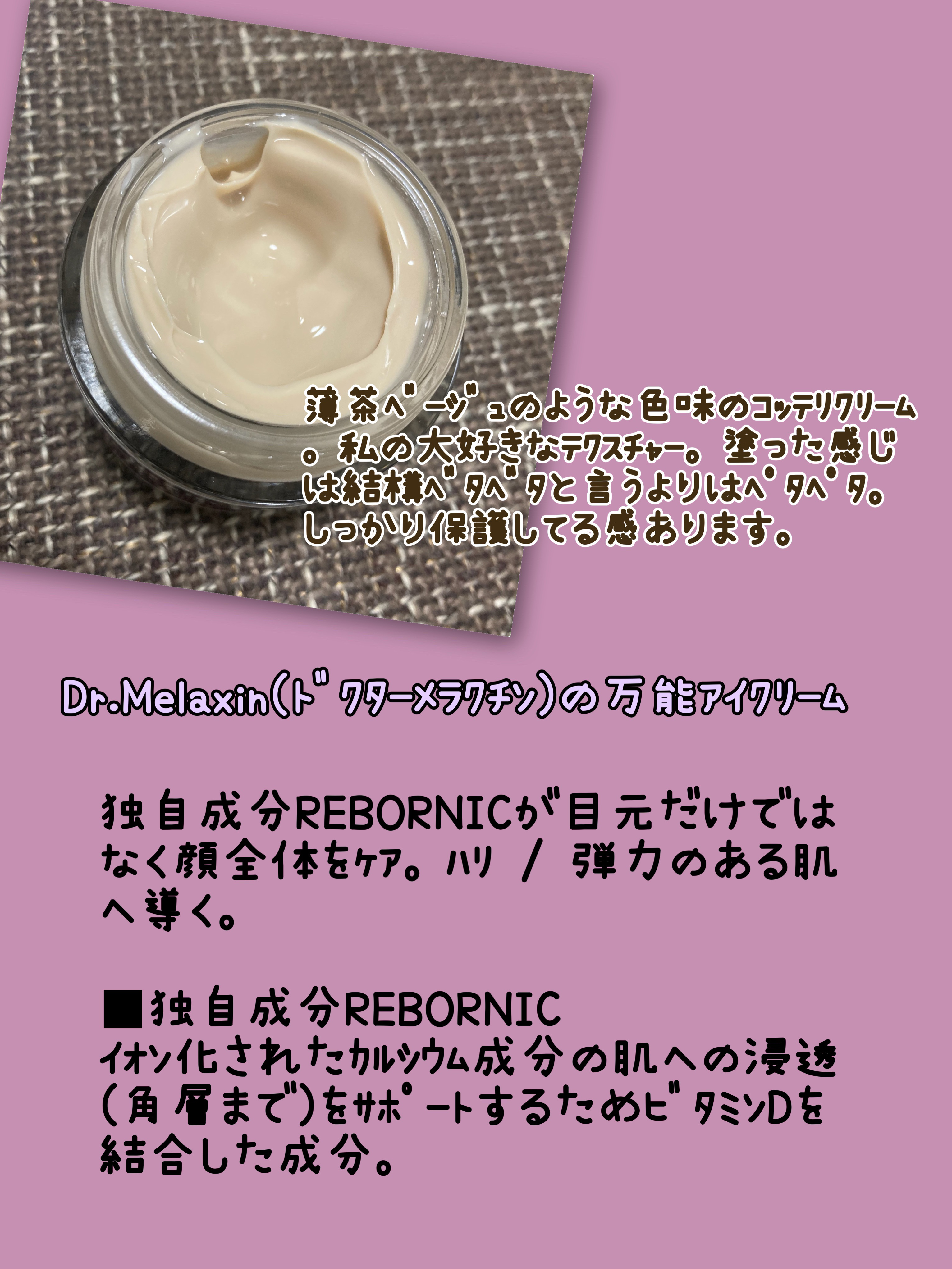カルシウムで目元のたるみケア✨ コラーゲンだけでは足りない目元ケアにカルシウムで肌の骨組みからハリ・弾力チャージ✨ とろみがあるテクスチャーだけど、肌なじみがよくさっぱりした使用感✨ こっくり濃厚なクリームで、ベタつくことなくしっとり保湿感があって◎👌✨