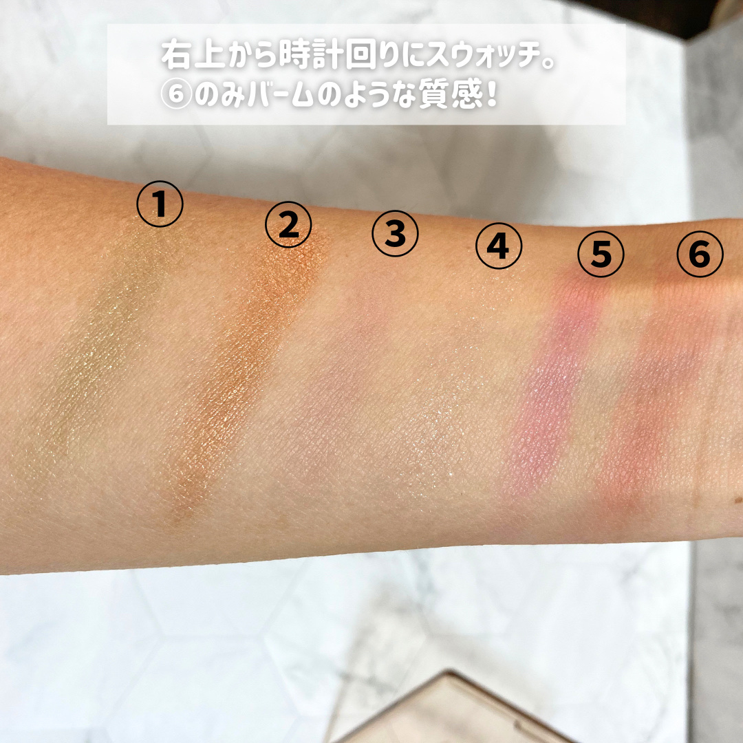 6色の中から、時計回り、反時計回りに4色を重ねるとおしゃれな目元になる!というパレットです。 重ねることで深みが増して、可愛い&ミステリアスな目元に仕上がる素敵なパレットです。 WHOMEEの商品は質感がデパコス級!粉の触り心地が良く、指で塗るのが楽しい♡
