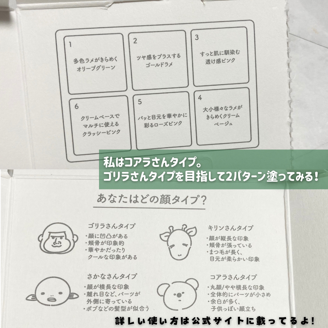 - かさねてつくる“透け感”パレット ①顔タイプを4つに分類!イガリ的骨格理論アイシャドウ 顔のタイプを「ゴリラ/キリン/コアラ/さかな」の4つに分け、その顔にあったアイシャドウの使い方をオススメするイガリ的骨格理論アイシャドウパレット。 色を重ねることでそれぞれ透け感、立体感※を作ることができます。もちろん、自由自在にも使用していただけます。 ※メークアップ効果による ②こだわりのカラー それぞれイガリ的骨格理論に基づいた6色をチョイス。 他のブランドにはない※理論派ヘアメイク・イガリシノブならではの配色に。各パレット隣のカラーと重ねると、綺麗なグラデーションに仕上がります。 ※自社調べ ③2種類のテクスチャー ラメやマットの使いやすいパウダー5色と、しっとりとしてベースとしても使える練りタイプ1色。2種類のテクスチャーが1つのパレットに入っています。 ④WHOMEE初の6色パレット WHOMEE初の6色パレットで、イガリシノブの独自理論を具現化。WHOMEE渾身のアイシャドウパレットとなっています。 2024年2月15日(木)AM10:00~公式オンラインショップ、2024年2月22日(木)以降順次全国のバラエティーショップにて発売