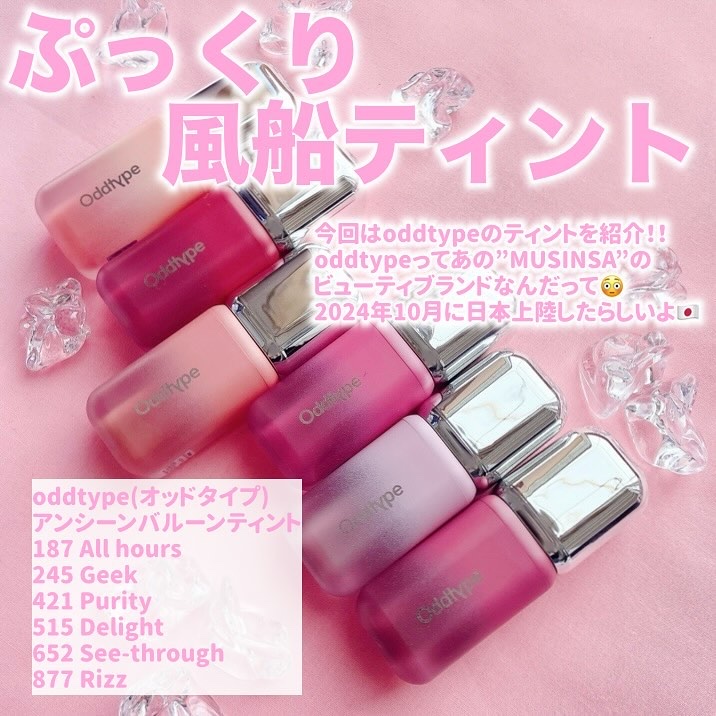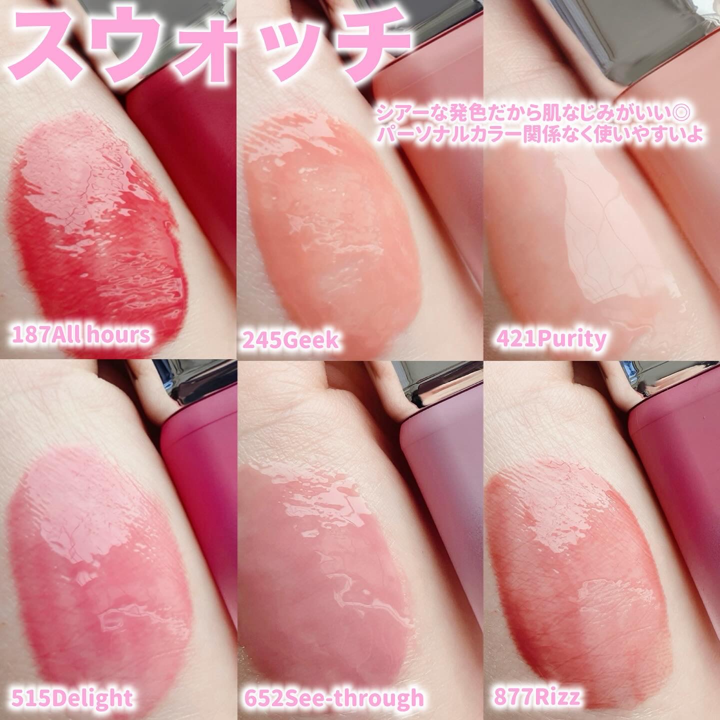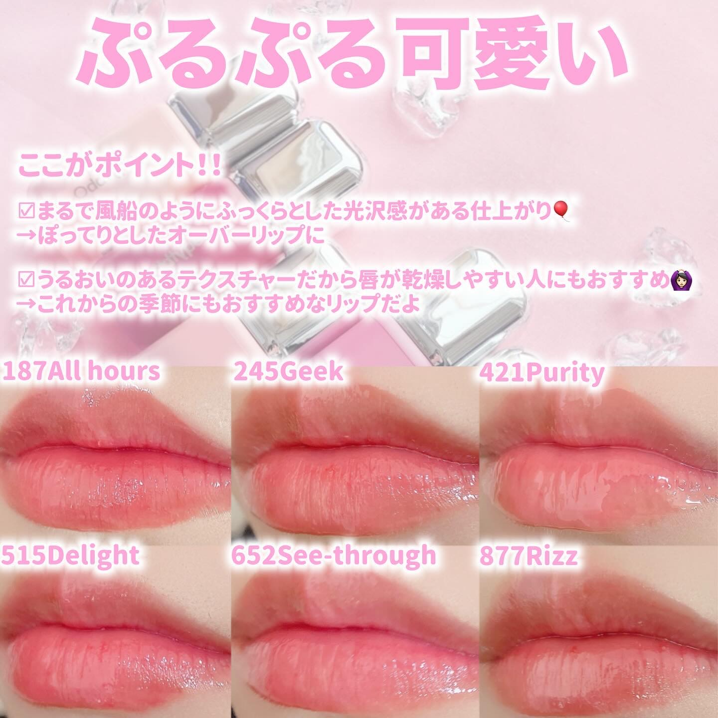 2024年10月に日本上陸したばっかり🥺💓 🌸187 All hours 🌸245 Geek 🌸421 Purity 🌸515 Delight 🌸652 See-through 🌸877 Rizz の六種類✨ 私は特に877のリズと、187のオールアワーズがお気に入り〜!!!厚手のオーバーリップが簡単に作れるよ🥰 可愛いし持ってるだけでイイ女感ただよう✌笑 ロフトで購入できるからチェックしてみてね✔🩷
