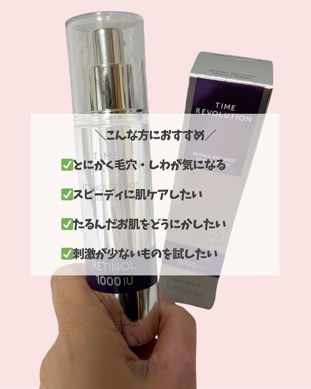 毛穴とシワ集中ケア✨ 韓国、日本で話題のMISSHAのタイムレボリューションから、新シリーズ「レチノール」 なめらかでしっとりした使い心地 私はあまりチクチクする感じがなく、スピキュールセラムって忘れるくらい🫢 敏感肌でスピキュール心配な方にもおすすめ やさしい使い心地でした🥰