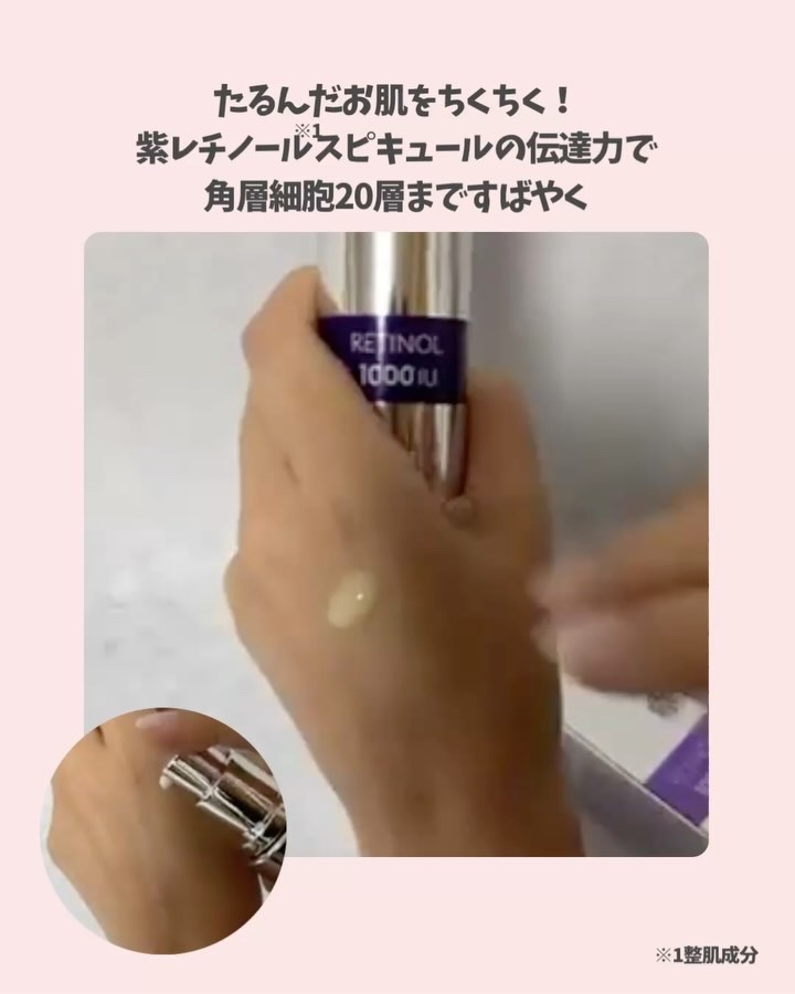 - ・高純度99%のスピキュール*にレチノール*をコーティングし、針状の形状でダイレクトに角質層まで届ける。 ・毛穴*1よりも小さいスピキュールが、気になる毛穴*1にダイレクトにアプローチし、ハリのあるピンとした肌へ導く。 ・ 26回の精製を経て不純物を取り除いた高純度スピキュール*3を使用することで、肌への刺激を軽 減。 ・気分ほぐれる精油の香り。人工香料フリー、敏感肌刺激テスト済*5。 *¹ 乾燥による毛穴 *² 整肌成分:レチノール *³ 整肌成分:加水分解カイメン *⁵ 全ての方に皮膚刺激が起こらないというわけではありません