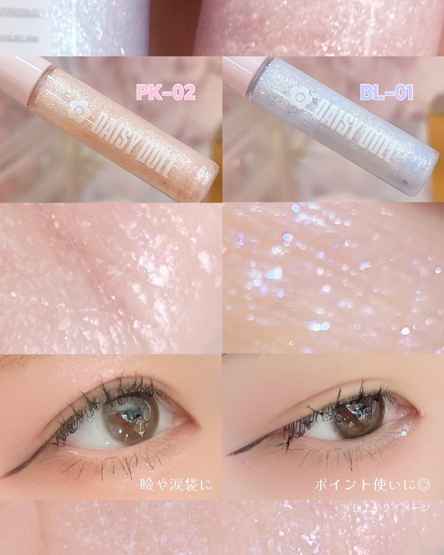 デイジードールのグリッターアイカラーに新色2色が数量限定で登場❄ 🩷 PK-02 🩵BL-01 ラメ落ちしにくい密着ジェル処方だからピタッと密着して綺麗なキラキラが続くのも◎
