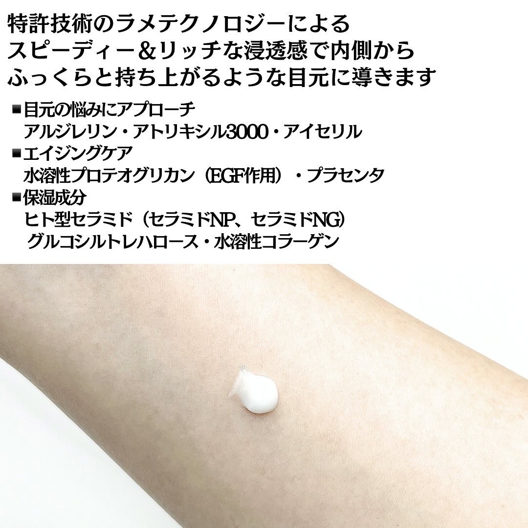 - ~素早く浸透、ふっくらハリ感。リッチな目元集中ケアクリーム~ さまざまな目元の悩みを多角的にケアする目元専用クリーム。特許技術のラメラテクノロジー(R)によるスピーディ&リッチな浸透感で、内側からふっくらと持ちあがるような目元に導きます。目元のために選び抜かれたペプチド成分(アルジレリン、アイセリル、マトリキシル3000)、水溶性プロテオグリカン、プラセンタ、水溶性コラーゲン、ヒト型セラミドなどが角層のすみずみに浸透し、目元を高いうるおいとハリ弾力で満たします。