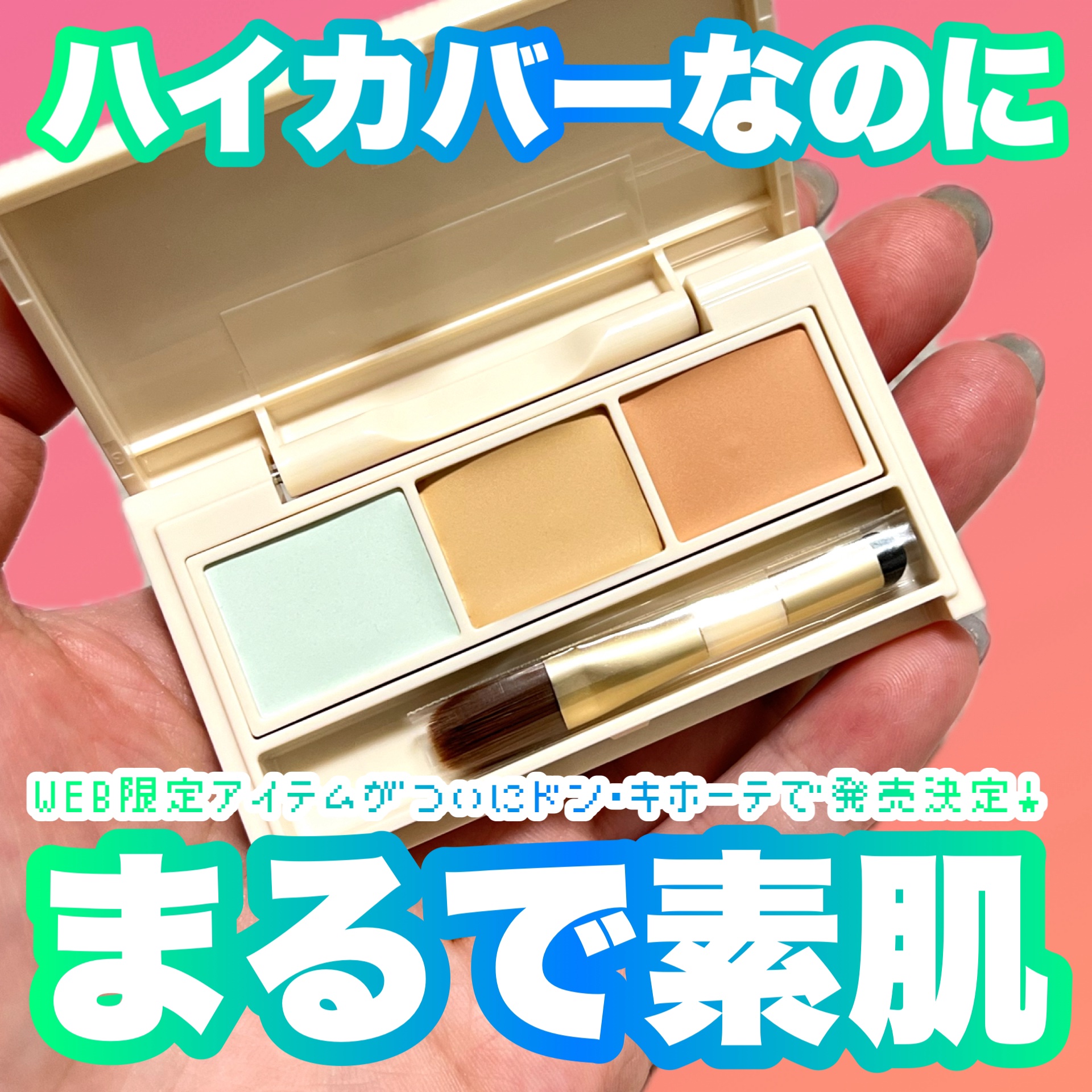 1つのパレットに3色入った多機能コンシーラーです❕ ミントに明るめのアイボリーを合わせたカラー▶︎ニキビやニキビ跡、肌の赤みをカバー しっかりカバーしてくれるのに、厚塗り感なく素肌っぽい仕上がりでナチュラル🥰 付属のブラシも優秀で、広い面をブラシで、スポットをチップでカバーできます💓 ドン・キホーテとWEB限定なので、気になってる方はチェックしてみてください💖