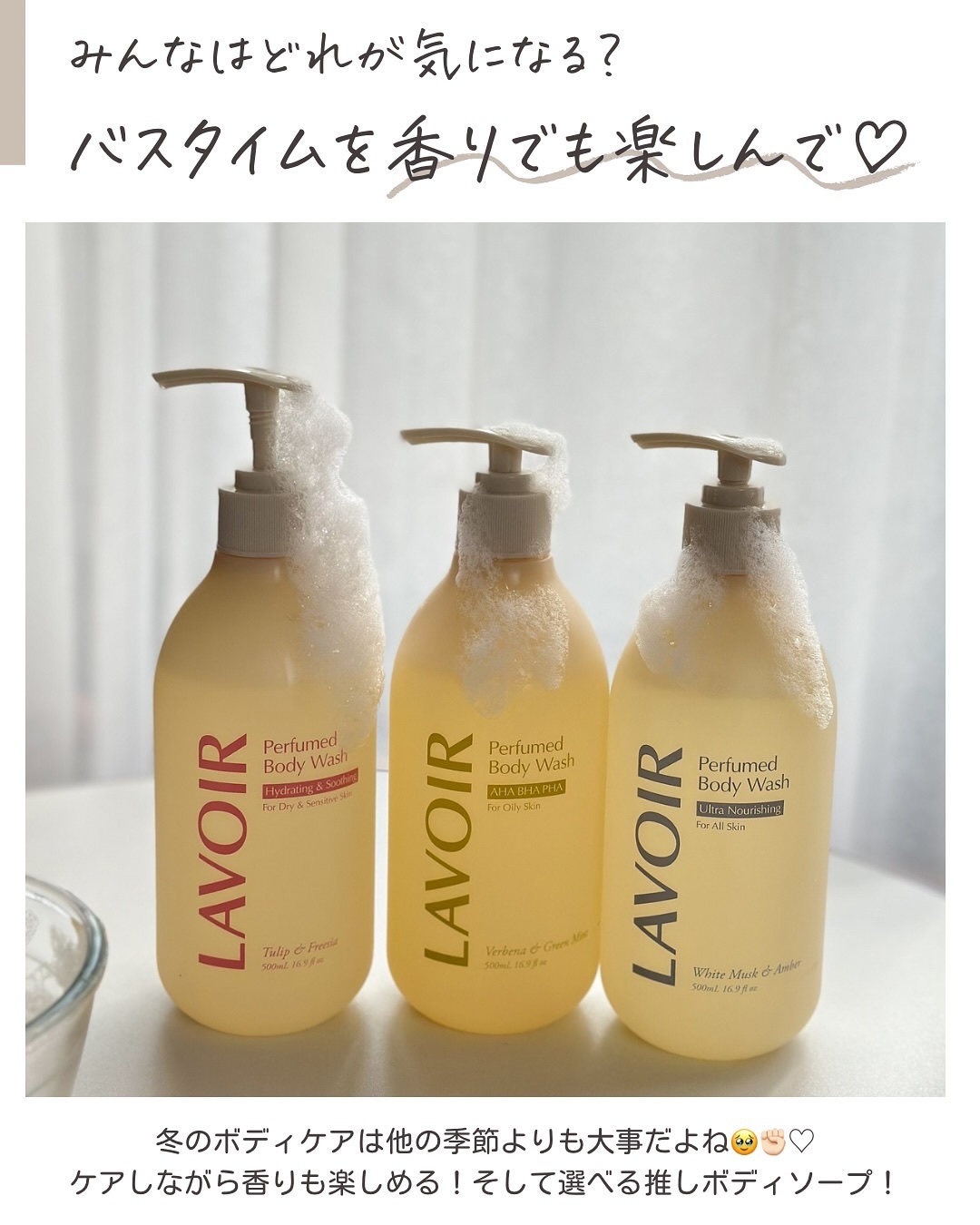 出した瞬間からいい香り漂うボディウォッシュ🫧୨୧୨୧🛒LAVOIR@lavoir_jpパフュームボディウォッシュホワイトムスク&アンバー500ml¥2,600(Qoo10価格)୨୧୨୧低刺数処方で敏感肌さんも使えるボディウォッシュ!パウダリー...