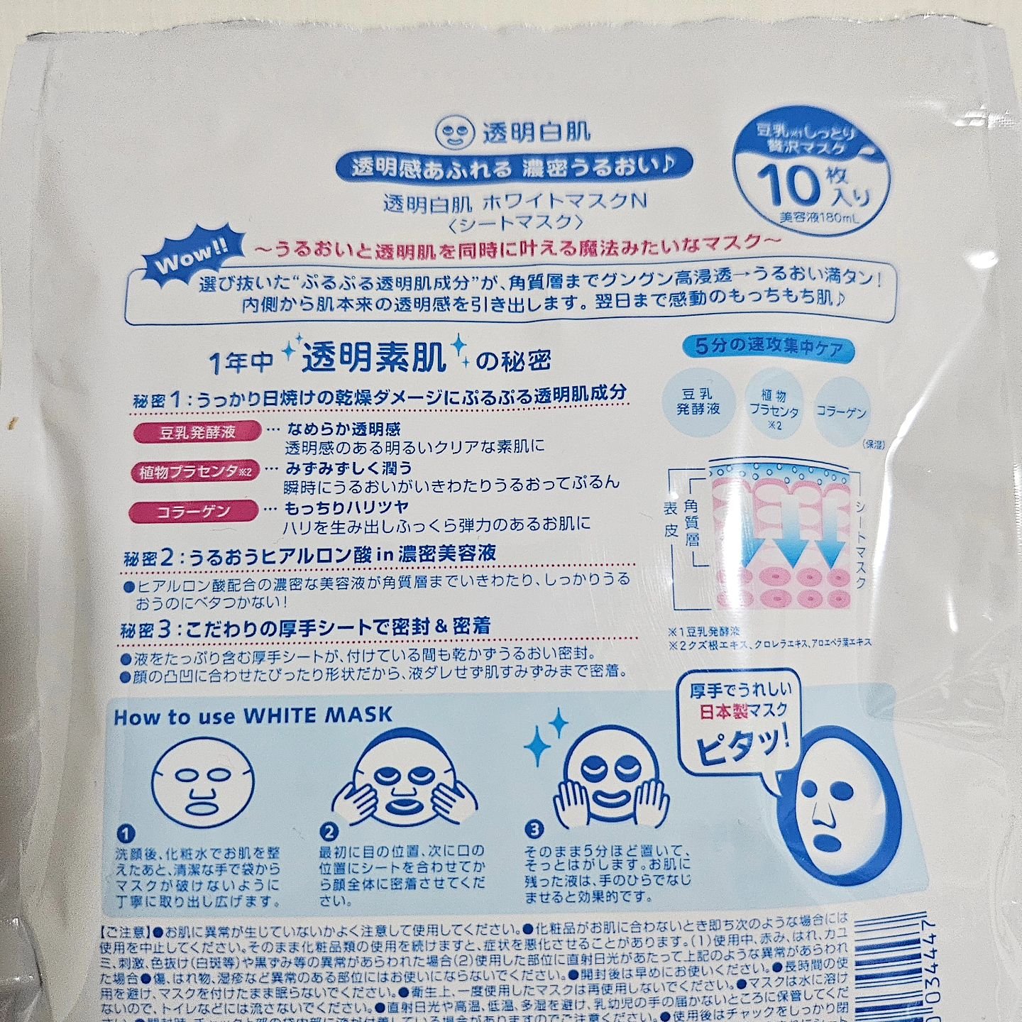 - <ホワイトマスクN> 水、グリセリン、BG、エタノール、ヒアルロン酸Na、加水分解コラーゲン、豆乳発酵液、クズ根エキス、クロレラエキス、アロエベラ葉エキス、ユキノシタエキス、ボタンエキス、ダイズ種子エキス、クエン酸、クエン酸Na、キサンタンガム、(スチレン/VP)コポリマー、ポリソルベート80、メチルパラベン、フェノキシエタノール