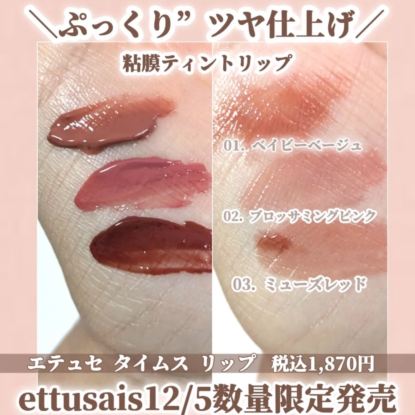 じゅわっとツヤがあふれてぷっくり仕上げ* 塗ったあとにツヤオイル膜が浮き上がる、ツヤUPテクノロジー✨️ リップティントの私的にこうだったらいいのにな〜って所が全て叶えられててめっっっちゃ好きでした😭💞💞💞 粘膜カラーで、白浮き無し、透明感あるちゅるんと感、おもたすぎないぷっくり唇😍😍😍 これ、、、数量限定なのー!?!! 公式みたら数量限定になってて、ぜひ定番化してほしいまじで好きすぎる😭😭😭😭