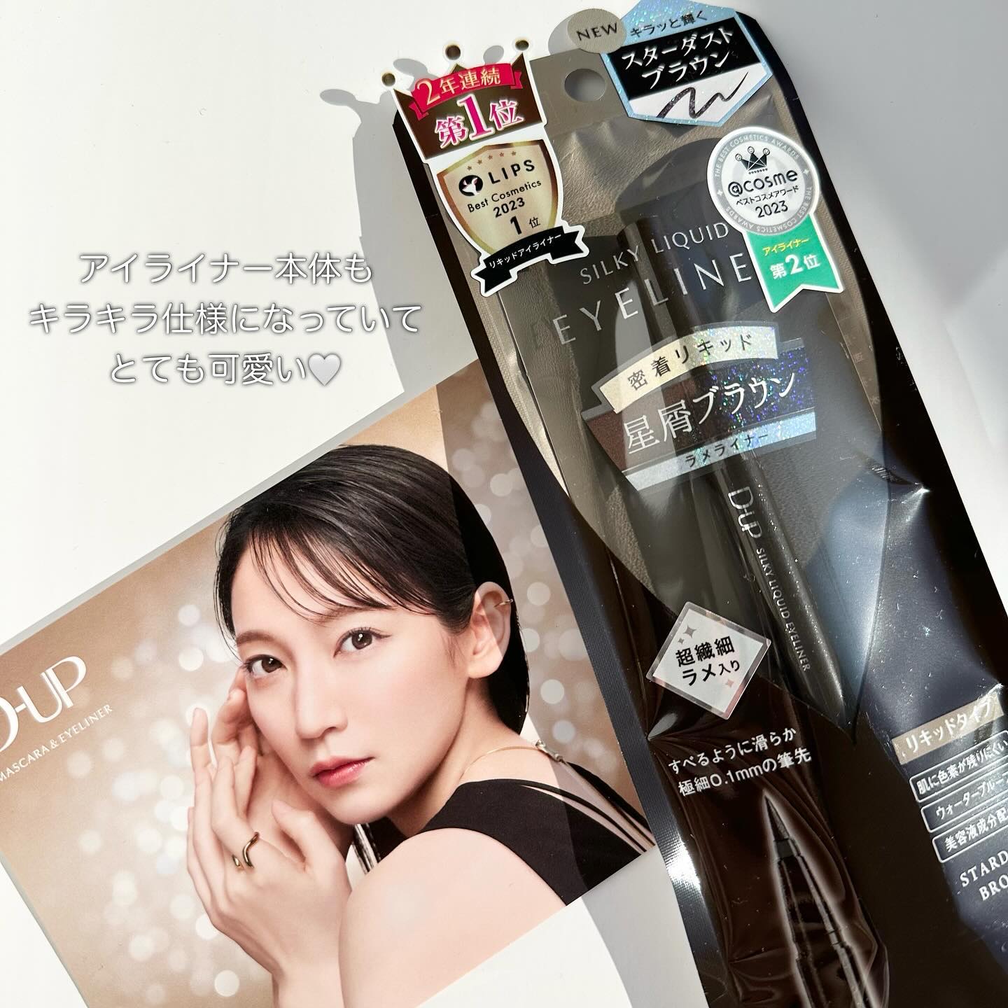 D-UPのアイライナーは、しなやかでコシのある極細0.1mmの筆先で、するするとなめらかで描きやすいのに、落ちにくいというのが特徴☝️ 今回使用したスターダストブラウンは、星屑を散りばめたような繊細な輝きで、ベースは透け感のあるダークブラウン🧸 ブラウンカラーだから瞳に馴染みやすい自然な仕上がりなんだけど、角度によってキラッと存在感を出してくれてめちゃくちゃ可愛くておすすめ💗