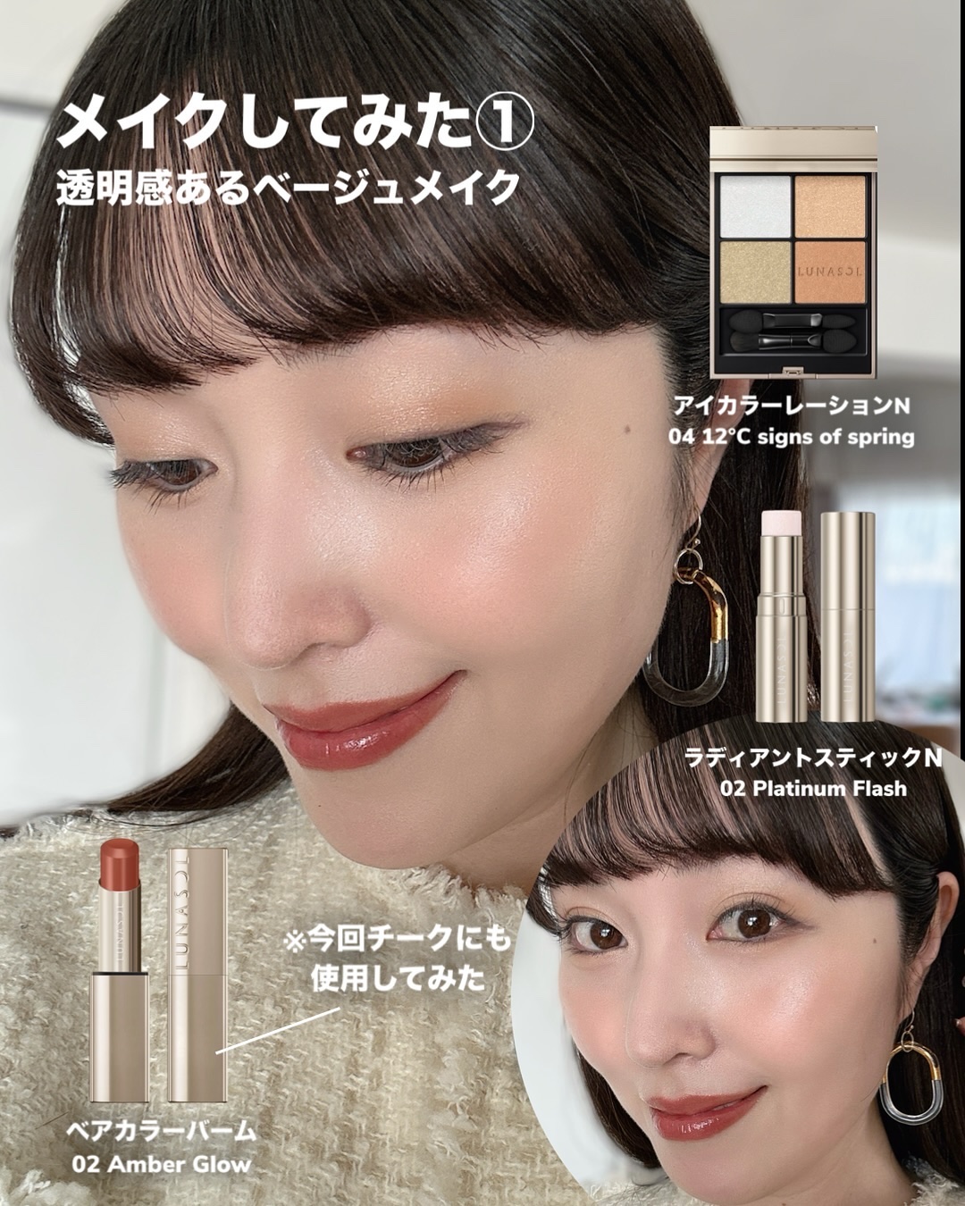 暖かさと透明感のあるカラーが可愛すぎて悶絶いたしました。 輝き方の違うパールが入っていて重ねるほどに透明感が増していくの…! 明るめのベージュ系で一見淡すぎるかな?と思ってしまったんだけど 4色重ねると儚い雰囲気を纏いつつ、凛とした強さも感じられるような絶妙パレット。