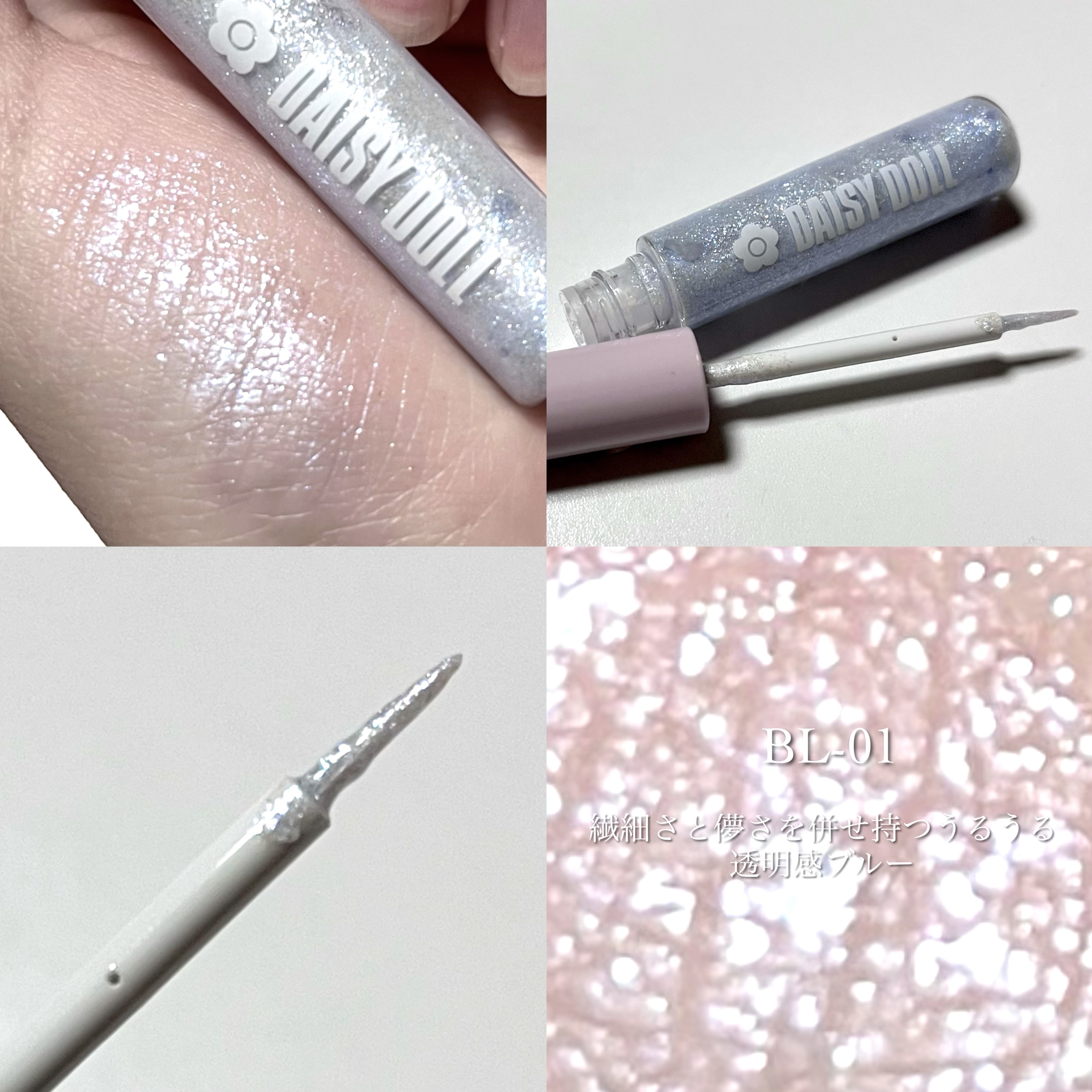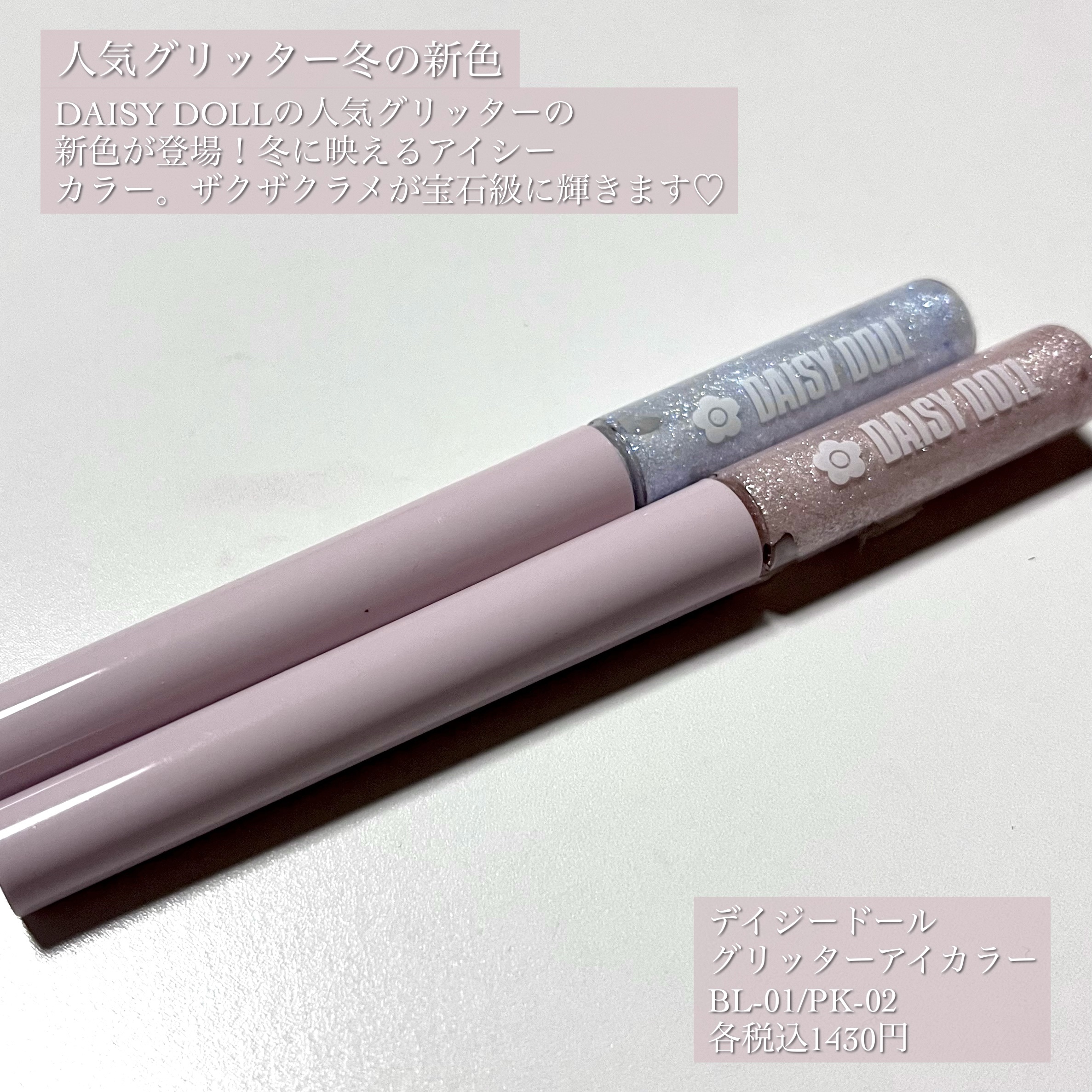 目元で輝く星屑グリッター DAISY DOLL by MARY QUANTのグリッターを紹介したいと思います♡ BL-01は泣いたようなうるうるEyeに、PK-02は肌に馴染みやすく大人っぽいうるみEyeに見せてくれてどちらも使いやすかったです♡ 冬のイルミネーションメイクやデートメイクにぴったりだと思いました🤍