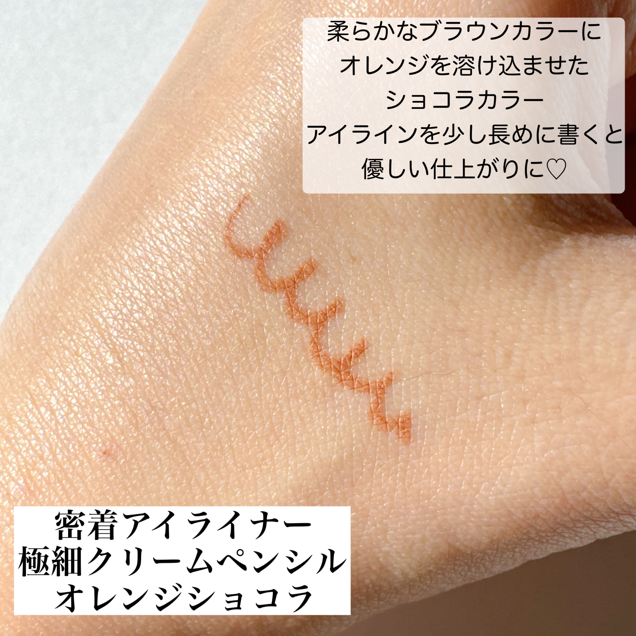 発色が良くて、左下のオレンジがパール感ありとても綺麗です🍊気に入りすぎて、今シーズンヘビロテしています。 柔らかいブラウンの色味が合うかなと思い使用しています✌️ 細かく描けるので目尻にハートマークを描いてみました🧡 ウォータープルーフなアイライナーは助かります。 ショート筆リキッドについては、先日別投稿で詳しく紹介しているので良かったら見てください😊