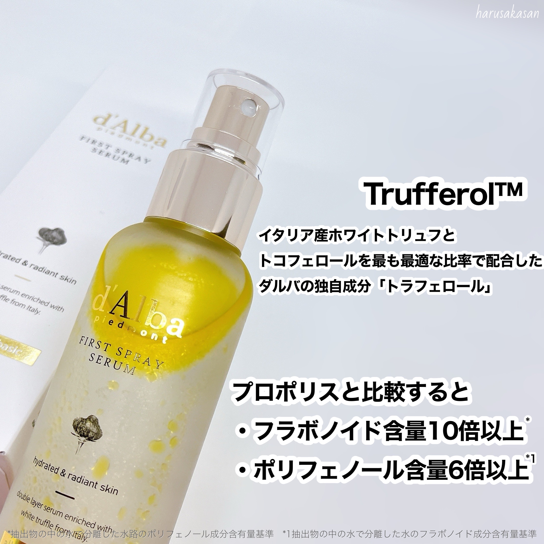 BeautyMeets企画でいただきました。#ダルバホワイトトリュフファーストスプレーセラム(エッセンス) 50mld'Albaなんとイタリア産ホワイトトリュフ配合で少しリッチな気分になれる保湿ケアミストです。少し黄色みのあるさらさらのオイル...