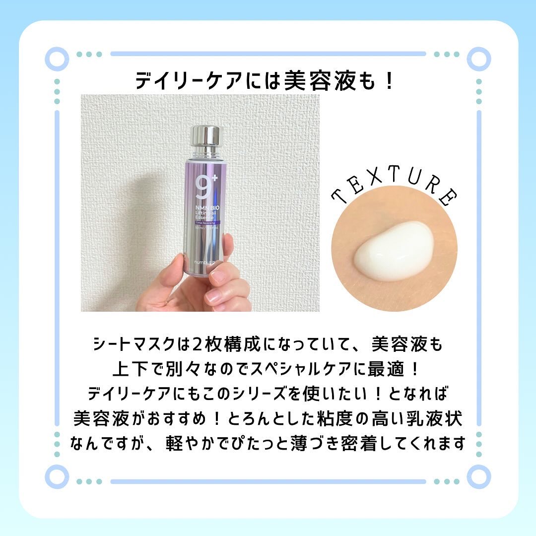 NMN配合でお肌にハリを与えて たるみ毛穴を撃退してくれます♪ NMNは老化を遅らせる成分として世界的に注目の成分です😳 上下でシートの素材や含まれるエッセンスの種類まで異なります! ▶️額〜鼻にかけて貼るシート(上)柔らかいとろみのあるシートでNMNエッセンスたっぷり配合✨ ▶️ 顎〜首にかけて貼るシート(下)「溶ける糸PLA成分」を使用したシート 首まであるので年齢の出やすいシワケアまで可能👌