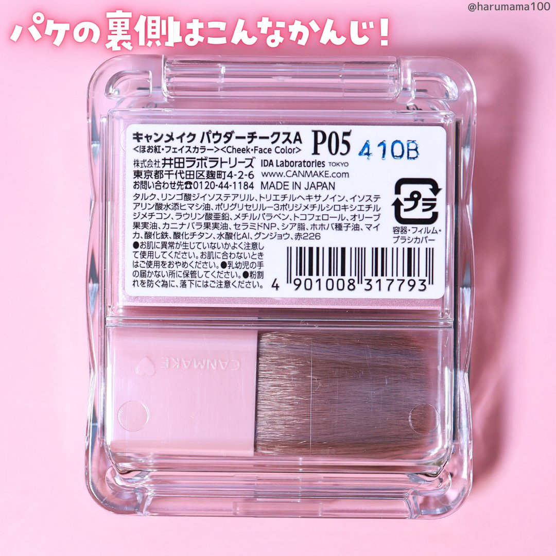 - <P01 パワフルピンク> タルク、リンゴ酸ジイソステアリル、合成フルオロフロゴパイト、トリエチルヘキサノイン、イソステアリン酸水添ヒマシ油、ポリグリセリル-3ポリジメチルシロキシエチルジメチコン、ラウリン酸亜鉛、メチルパラベン、酸化スズ、トコフェロール、オリーブ果実油、カニナバラ果実油、セラミドNP、シア脂、ホホバ種子油、マイカ、グンジョウ、酸化チタン、酸化鉄、赤202、赤226 <P02 リトルシャイピンク> タルク、リンゴ酸ジイソステアリル、トリエチルヘキサノイン、イソステアリン酸水添ヒマシ油、ポリグリセリル-3ポリジメチルシロキシエチルジメチコン、ラウリン酸亜鉛、メチルパラベン、トコフェロール、オリーブ果実油、カニナバラ果実油、セラミドNP、シア脂、ホホバ種子油、マイカ、グンジョウ、酸化チタン、水酸化Al、酸化鉄、赤226 <P03 チアフルピーチ> タルク、リンゴ酸ジイソステアリル、トリエチルヘキサノイン、イソステアリン酸水添ヒマシ油、ポリグリセリル-3ポリジメチルシロキシエチルジメチコン、ラウリン酸亜鉛、合成フルオロフロゴパイト、メチルパラベン、トコフェロール、オリーブ果実油、カニナバラ果実油、セラミドNP、シア脂、ホホバ種子油、酸化スズ、マイカ、酸化チタン、酸化鉄、赤226 <P04 クレバーベージュ> タルク、リンゴ酸ジイソステアリル、トリエチルヘキサノイン、イソステアリン酸水添ヒマシ油、ポリグリセリル-3ポリジメチルシロキシエチルジメチコン、ラウリン酸亜鉛、メチルパラベン、トコフェロール、オリーブ果実油、カニナバラ果実油、セラミドNP、シア脂、ホホバ種子油、マイカ、グンジョウ、酸化チタン、酸化鉄、赤226 <P05 クラッシーモーヴピンク> タルク、リンゴ酸ジイソステアリル、トリエチルヘキサノイン、イソステアリン酸水添ヒマシ油、ポリグリセリル-3ポリジメチルシロキシエチルジメチコン、ラウリン酸亜鉛、メチルパラベン、トコフェロール、オリーブ果実油、カニナバラ果実油、セラミドNP、シア脂、ホホバ種子油、マイカ、酸化鉄、酸化チタン、水酸化Al、グンジョウ、赤226 <P40thx キューティーベリー> タルク、リンゴ酸ジイソステアリル、トリエチルヘキサノイン、イソステアリン酸水添ヒマシ油、合成フルオロフロゴパイト、ポリグリセリル-3ポリジメチルシロキシエチルジメチコン、ラウリン酸亜鉛、メチルパラベン、トコフェロール、オリーブ果実油、カニナバラ果実油、セラミドNP、シア脂、ホホバ種子油、マイカ、酸化チタン、赤226、グンジョウ、酸化鉄、水酸化Al