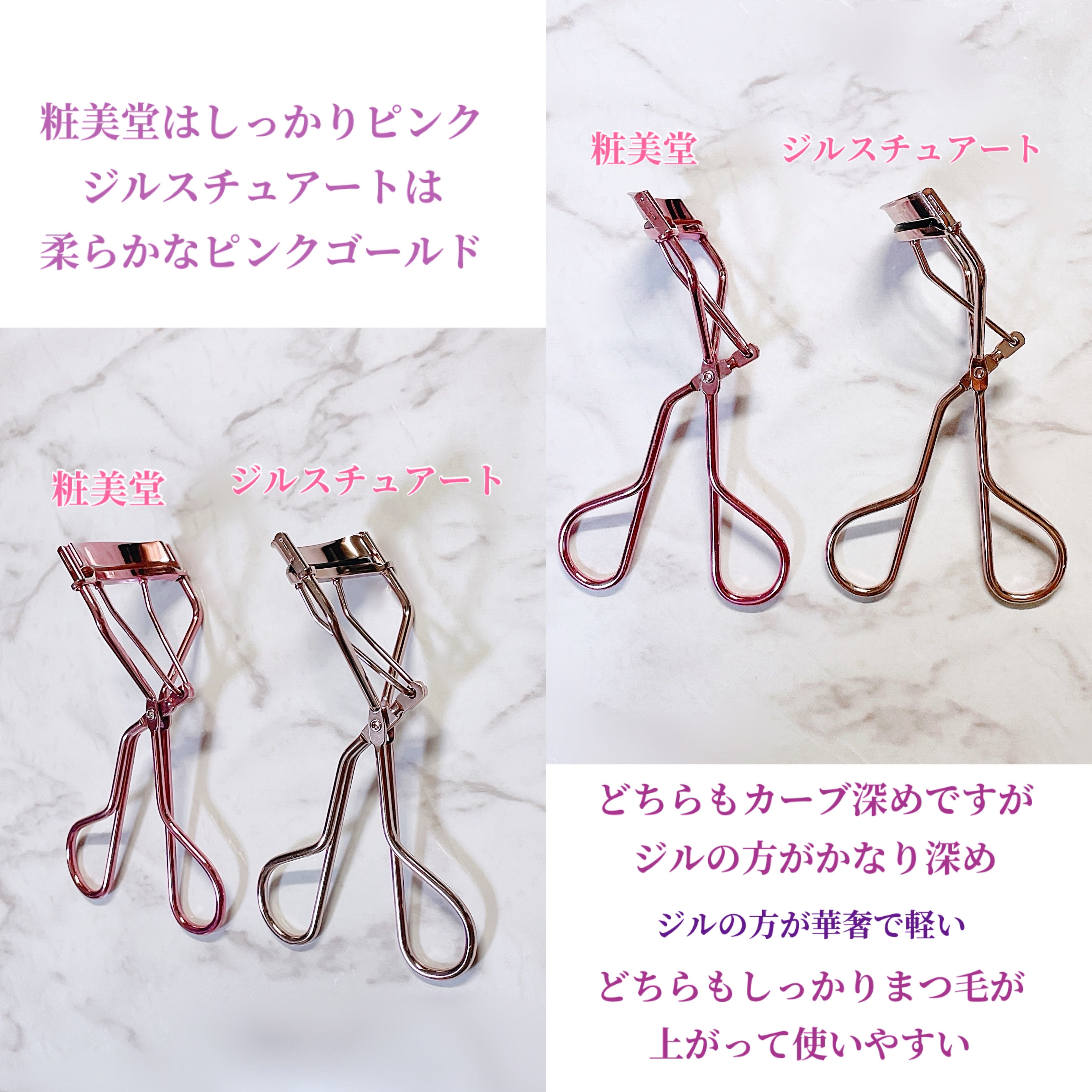 結構カーブ強めなビューラー。これを使う前は資生堂のビューラーを使っていたのだけど、パケが可愛いのとカーブ強めなビューラーが欲しくてJILLSTUARTのものを選んでみました。 ピンクゴールドで、チャームが付いていて可愛い🥰 使っているだけで嬉しい🥰 過去に使っていたビューラーよりもくるんとまつ毛を挟める感じがする😊