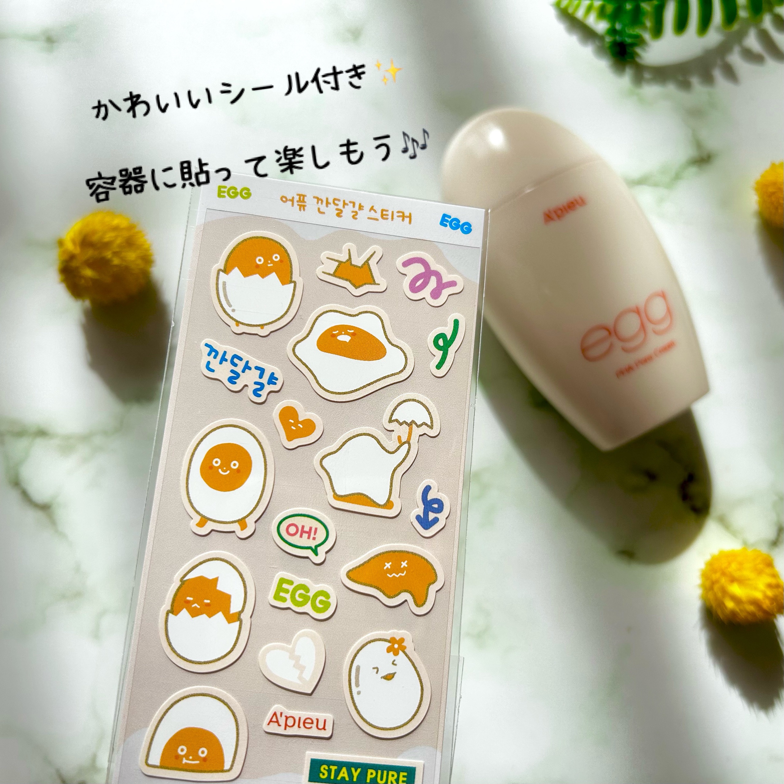 A'pieuの毛穴レスむき卵肌クリームです! @apieu_cosmetics ナイトスキンケア、化粧前スキンケアなどすべての場面で使用可能です! 3つの主要成分がカギです! ①成分PHA、アンチセボムP(Antisebum pore):皮脂、角質ケア ②成分ナイアシンアミド:着色汚れ落とし ③成分卵白(アルブミンエキス):垂れた毛穴を引き締める テクスチャーはベタつかずしっとりとした仕上がりになります! たまご型のこの形もかわいくて、おまけのステッカーで飾ることもできます!