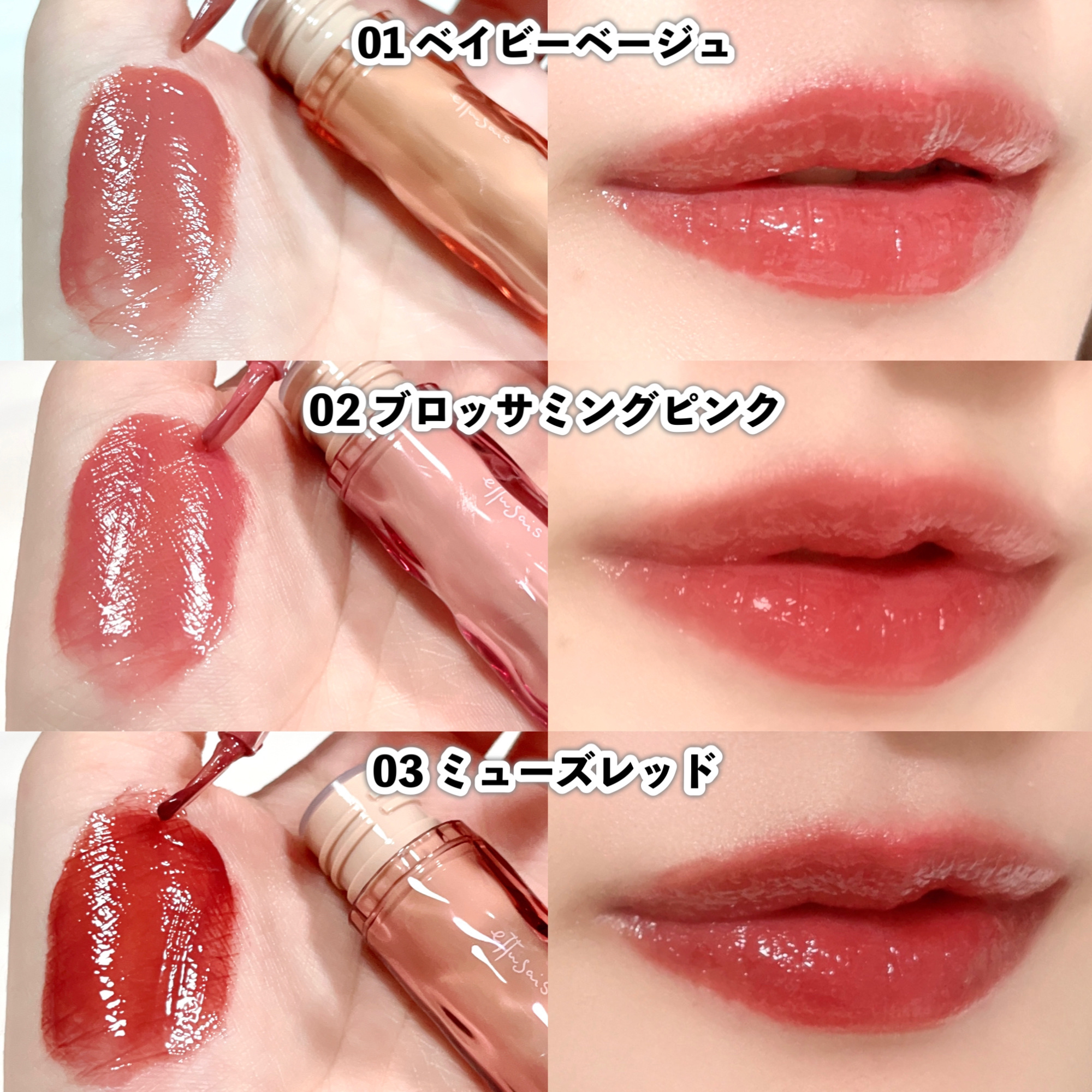 - <ベイビーベージュ> 水、リンゴ酸ジイソステアリル、ビスジグリセリルポリアシルアジペート-2、ジフェニルジメチコン、水添ポリイソブテン、トリメチルシロキシフェニルジメチコン、ポリフェニルシルセスキオキサン、グリセリン、セチルPEG/PPG-10/1ジメチコン、ポリソルベート60、イソステアリン酸ソルビタン、セテアレス-20、1,2-ヘキサンジオール、(アクリル酸ヒドロキシエチル/アクリロイルジメチルタウリンNa)コポリマー、酸化チタン、スクワラン、フェノキシエタノール、メントキシプロパンジオール、エチルヘキシルグリセリン、黄5、赤227、黄4、水酸化Al、ポリアクリル酸アンモニウム、BG、青1、テトラ(ジ-t-ブチルヒドロキシヒドロケイヒ酸)ペンタエリスリチル <ブロッサミングピンク> 水、リンゴ酸ジイソステアリル、ビスジグリセリルポリアシルアジペート-2、ジフェニルジメチコン、水添ポリイソブテン、トリメチルシロキシフェニルジメチコン、ポリフェニルシルセスキオキサン、グリセリン、セチルPEG/PPG-10/1ジメチコン、ポリソルベート60、イソステアリン酸ソルビタン、セテアレス-20、1,2-ヘキサンジオール、(アクリル酸ヒドロキシエチル/アクリロイルジメチルタウリンNa)コポリマー、スクワラン、フェノキシエタノール、メントキシプロパンジオール、酸化チタン、エチルヘキシルグリセリン、黄5、赤227、水酸化Al、黄4、ポリアクリル酸アンモニウム、青1、BG、テトラ(ジ-t-ブチルヒドロキシヒドロケイヒ酸)ペンタエリスリチル <ミューズレッド> 水、リンゴ酸ジイソステアリル、ビスジグリセリルポリアシルアジペート-2、ジフェニルジメチコン、水添ポリイソブテン、トリメチルシロキシフェニルジメチコン、ポリフェニルシルセスキオキサン、グリセリン、セチルPEG/PPG-10/1ジメチコン、ポリソルベート60、イソステアリン酸ソルビタン、セテアレス-20、1,2-ヘキサンジオール、(アクリル酸ヒドロキシエチル/アクリロイルジメチルタウリンNa)コポリマー、スクワラン、フェノキシエタノール、メントキシプロパンジオール、酸化鉄、酸化チタン、エチルヘキシルグリセリン、赤227、黄4、黄5、ポリアクリル酸アンモニウム、水酸化Al、青1、BG、テトラ(ジ-t-ブチルヒドロキシヒドロケイヒ酸)ペンタエリスリチル