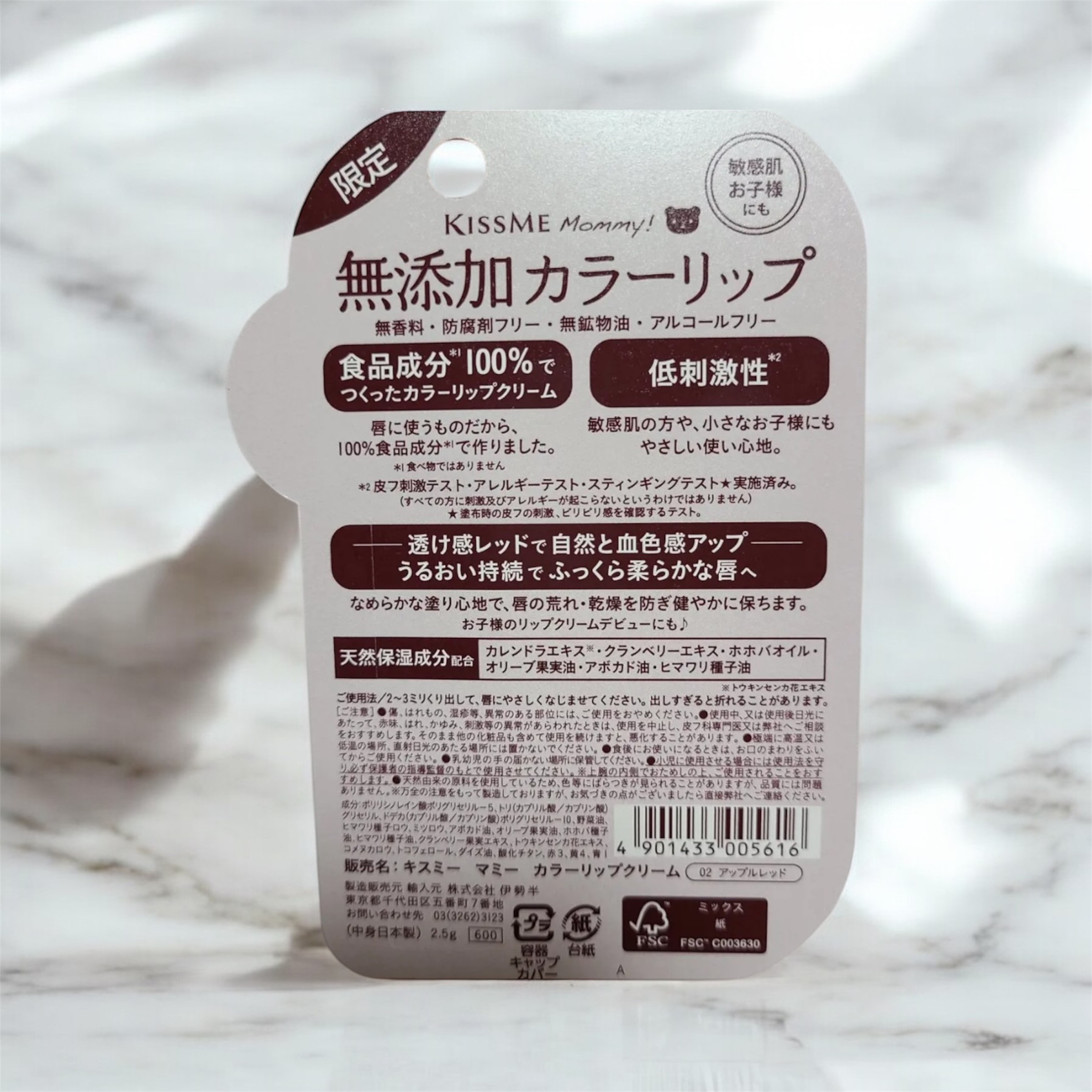 - 〈数量限定〉 親子の触れ合いタイムを楽しい時間に。食品成分※1100%のカラーリップクリーム ●食品成分※1100%でつくったリップクリーム 天然うるおい成分配合 唇に使うものだから100%食品成分※1でつくりました。 ※1 食べ物ではありません ●低刺激性※2 敏感肌の方や、小さなお子様にもやさしい使い心地。 ※2 皮フ刺激テスト・アレルギーテスト・スティンギングテスト(塗布時の皮フの刺激・ピリピリ感を確認するテスト)実施済み。 すべての方に刺激及びアレルギーが起こらないというわけではありません。 ●カラータイプでもうるおい持続。荒れがちな唇をしっかりケア なめらかな塗り心地で、唇の荒れ・乾燥を防ぎ健やかに保ちます。 ●天然うるおい成分配合 カレンドラエキス(トウキンセンカ花エキス)・クランベリーエキス・ホホバオイル・オリーブ果実油・アボカド油 ・ヒマワリ種子油(すべてうるおい成分)