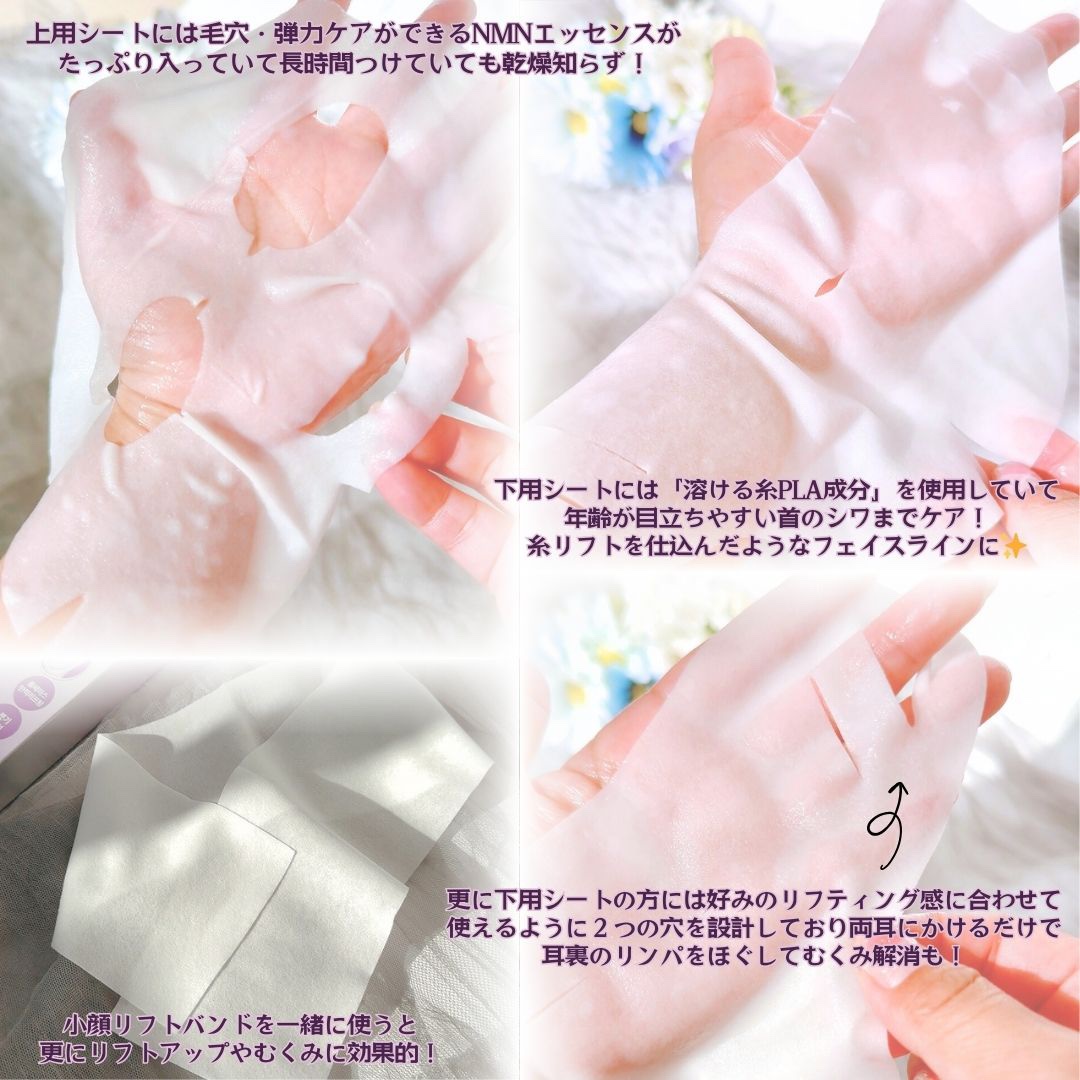 次世代成分NMN*¹配合🌿.∘ 年齢肌の悩みにアプローチする上下異なるフルフェイス3Dシートマスク✨ とろりとしたミルクのようなテクスチャー︎の美容液がたっぷり🤍 ベタつきなくしっとりとした使い心地で首までシートがあるので同時に首ケアできるのも良いです👍🏻 ̖́-︎ 付属で白いリフトバンドがついていて一緒に使うとさらにリフト感を感じられます︎🤍 結ぶ必要なくピタッと合わせるだけでくっつくので手軽🫶🏻🩷