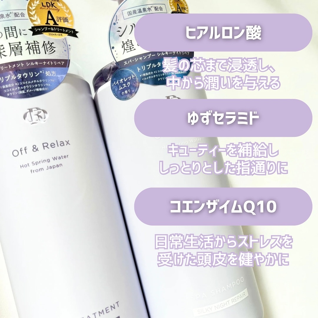 - Off&Relaxシルキーナイトリペアは髪のダメージ補修に特化したシリーズ。出雲・湯原・アルプスの3種の国産温泉水が頭皮と髪の汚れを優しく落とし、特別に配合されたトリプルタウリン※1が髪にハリ・コシを与えます。紫外線やパーマ、ヘアカラーからの髪ダメージを予防するヒートプロテクトテクノロジー※2を採用し、さらに五大保湿成分※3を配合して髪を芯から補修。キューティクルの整ったサロン帰りのような髪へ。オリジナルに調香したバイオレットムスクの香りは、まるで雨上がりの夜の花屋敷から漂う、咲き誇る花々の初々しくも、どこか神秘的で蠱惑的な香りがあなたのバスルームを包み込みます。 ※1ココイルメチルタウリンNa、ココイルメチルタウリンタウリンNa、タウリン※2メドウフォーム-δ- ラクトン配合によるダメージ補修のこと※3ユズセラミド、コエンザイムQ10、トレハロース、ヒアルロン酸、大豆タンパク