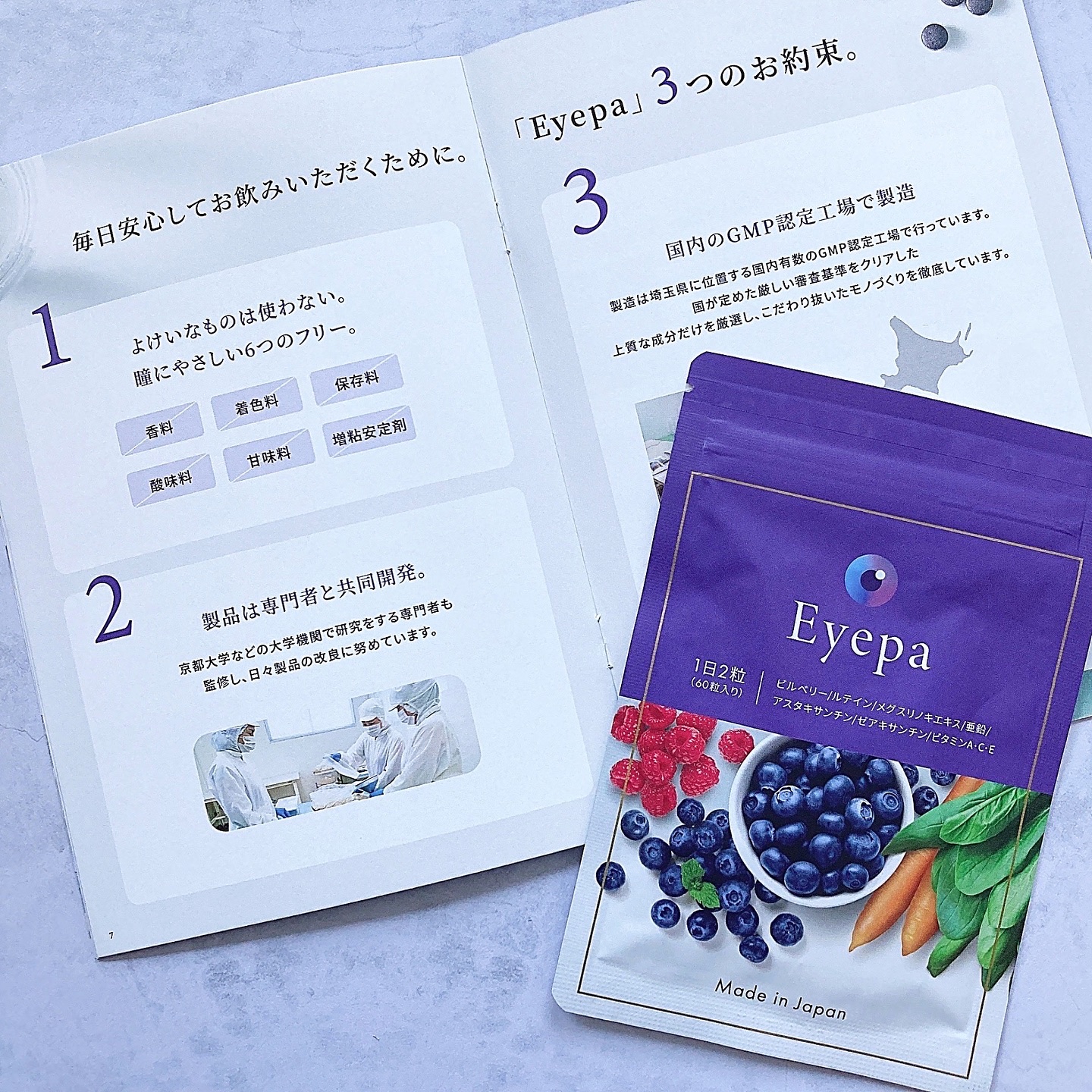 - 医師監修*のオールインワンサプリメントです。年齢関係なくクリアでいたい方に。「ビルベリー」や「ルテイン」はもちろん、「ゼアキサンチン」や「アスタキサンチン」「亜鉛」など、若々しく過ごす毎日を保つのに必要な10種類以上の栄養素をオールインワンに配合しました。 *原材料について医師監修 ※2025年7月〜一部成分 リニューアル